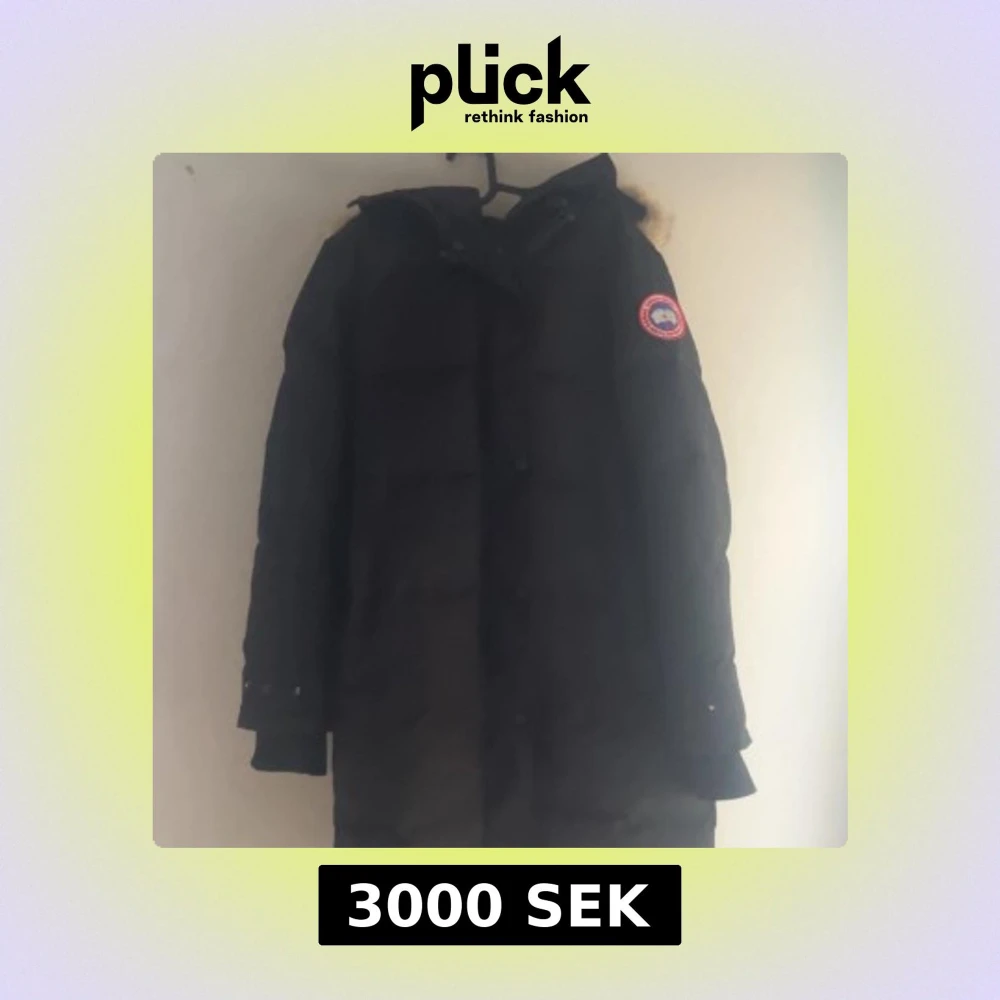 Säljer en svart dunjacka från Canada Goose med pälsdetalj på huvan. Jackan har en klassisk design med lång ärm och en broderad logotyp på ärmen. Perfekt för kalla vinterdagar. 🖤Har även tillbehör (påse)