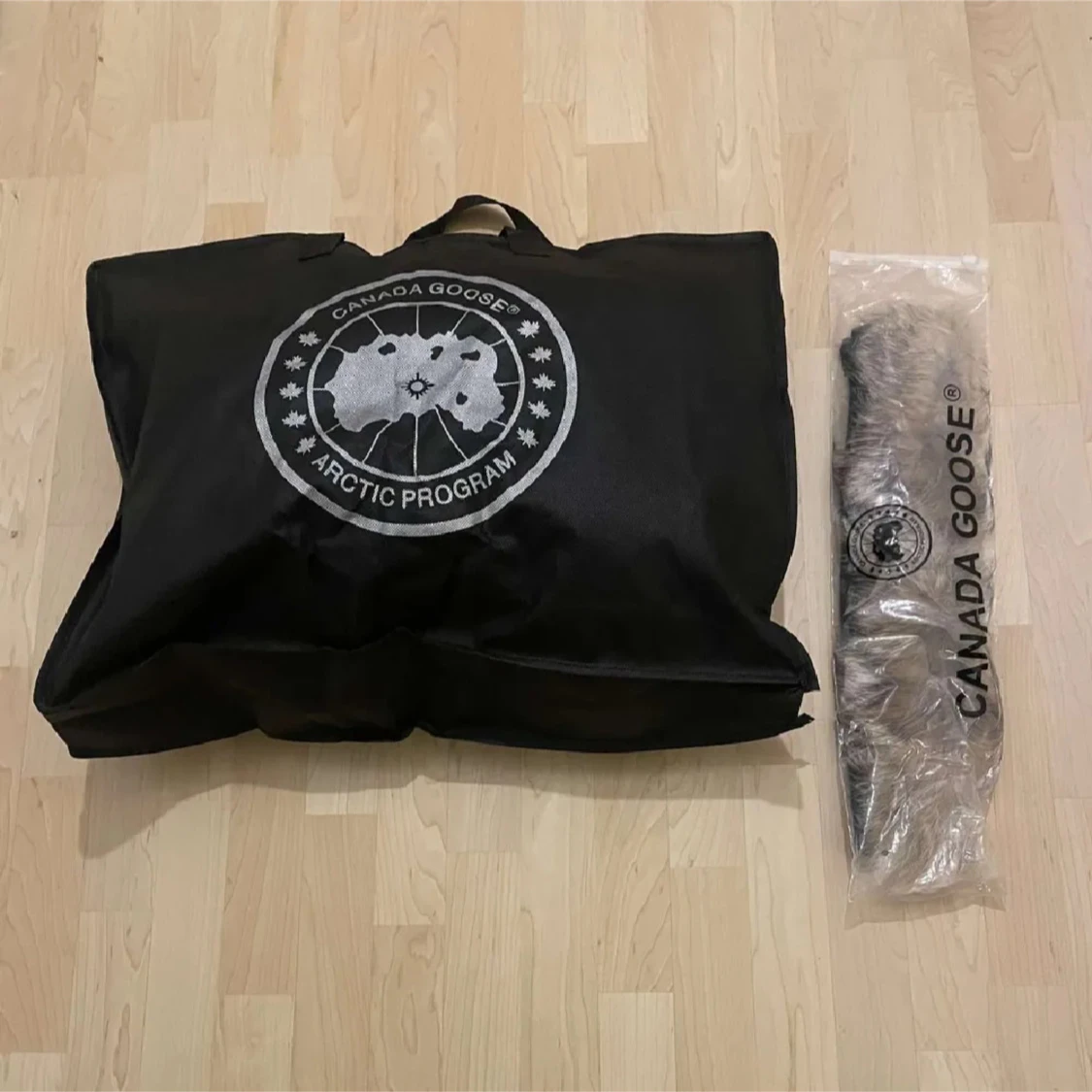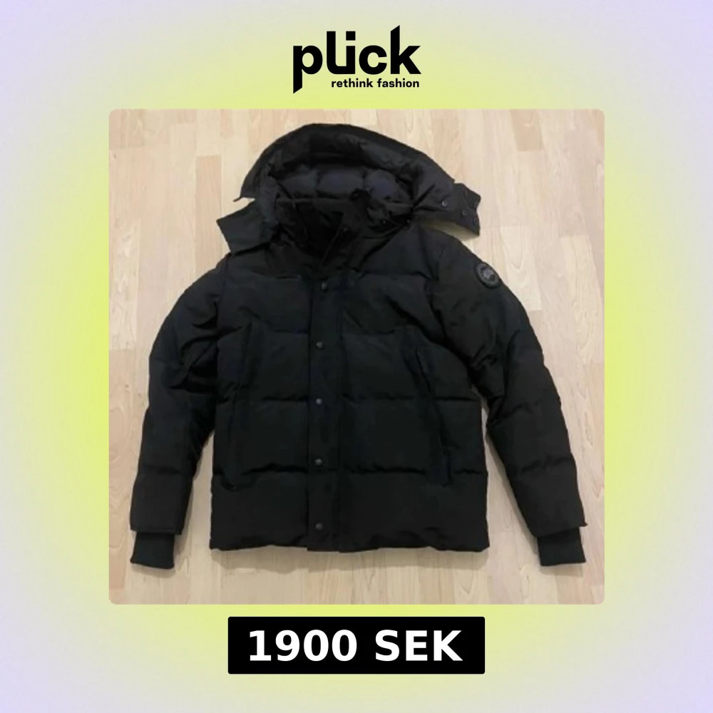 Säljer en svart dunjacka från Canada Goose med avtagbar huva och klassisk logga på ärmen. Jackan är tjockt vadderad, har långa ärmar och stängs med både dragkedja och knappar. Perfekt för kalla vinterdagar. Levereras med originalpåse och pälskrage.