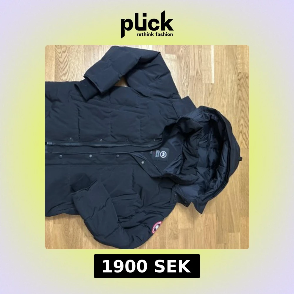 Säljer en svart dunjacka från Canada Goose med avtagbar päls på huvan. Jackan har en dragkedja och knappar framtill samt en broderad logotyp på ärmen. Perfekt för kalla vinterdagar. Storlek M