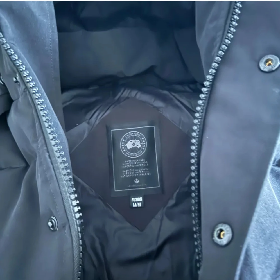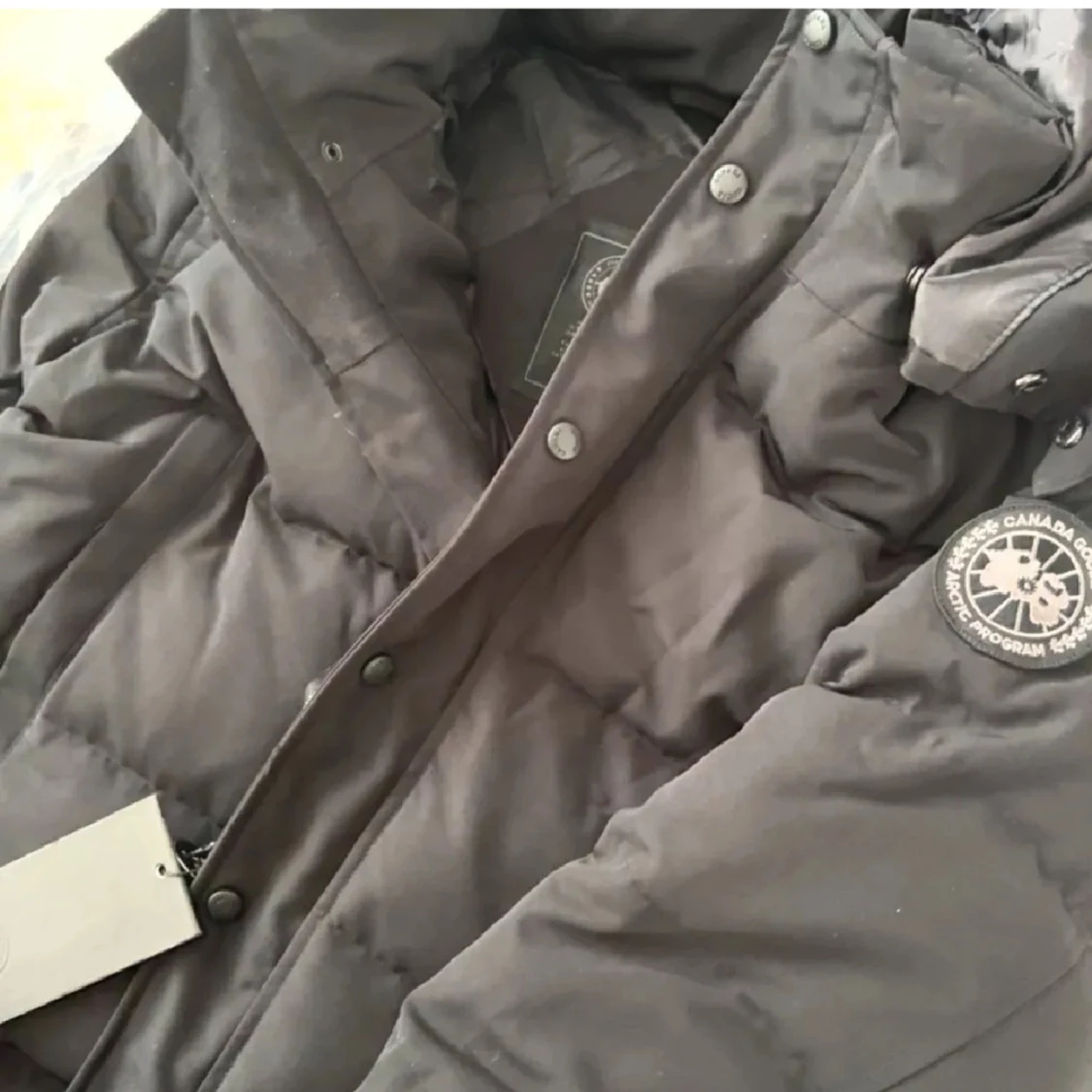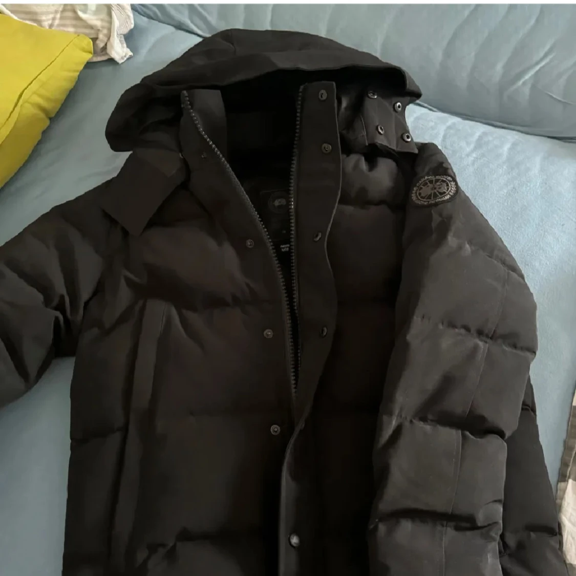 Säljer en svart dunjacka från Canada Goose med huva och dragkedja. Jackan har knappar och en logotyp på ärmen. Perfekt för kalla dagar. Aldrig använt