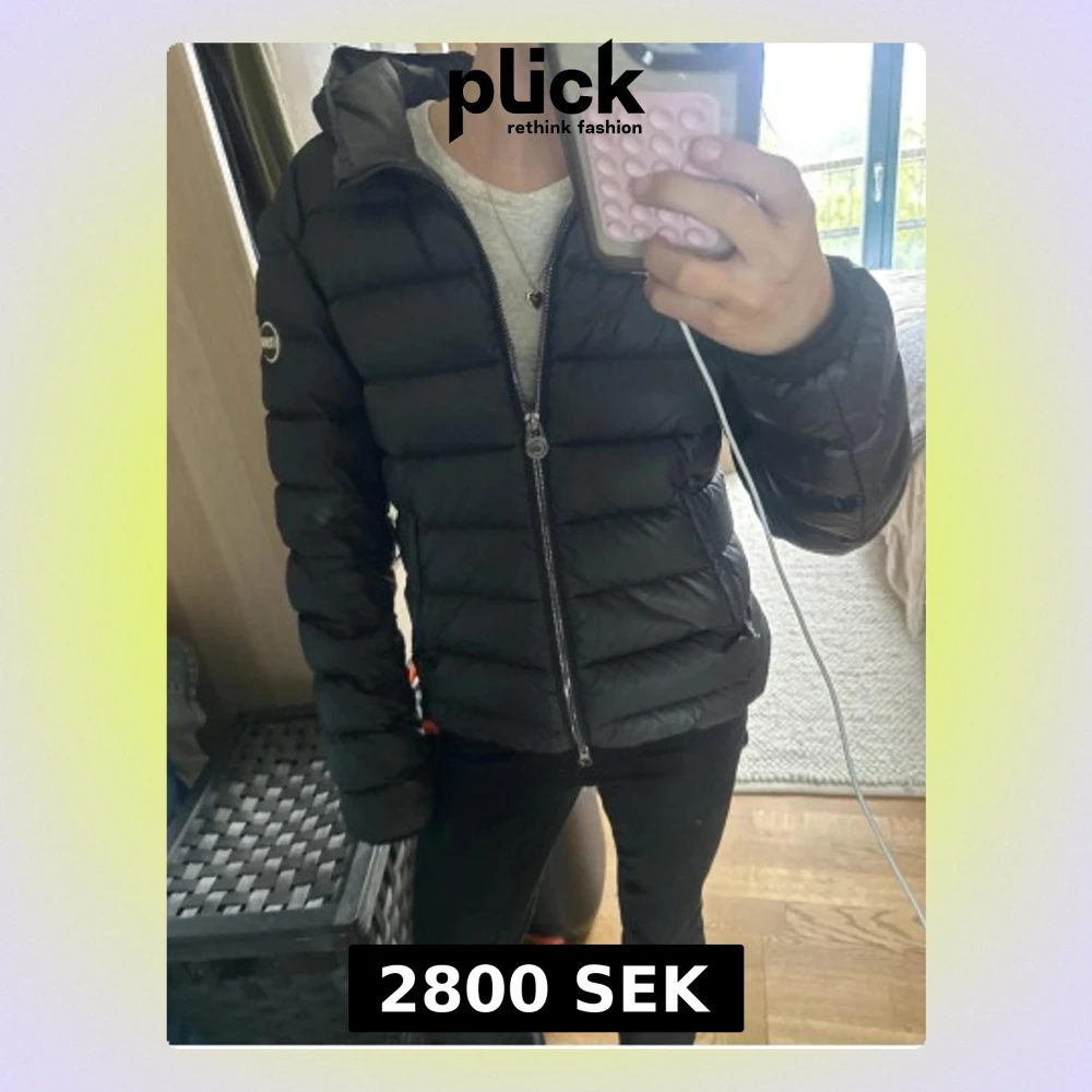 Snygg svart dunjacka från Colmar med dragkedja och huva. Jackan har en quiltad design och en rund logotyp på ärmen. Passar xs/s