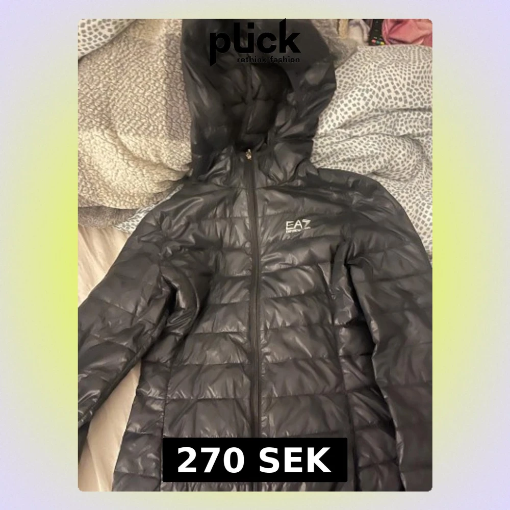 Säljer en svart dunjacka från EA7 Emporio Armani med huva och quiltad design. Jackan har dragkedja framtill och logotyp på bröstet. Perfekt för kalla dagar och har en snygg, sportig look. L men skulle säga M.
