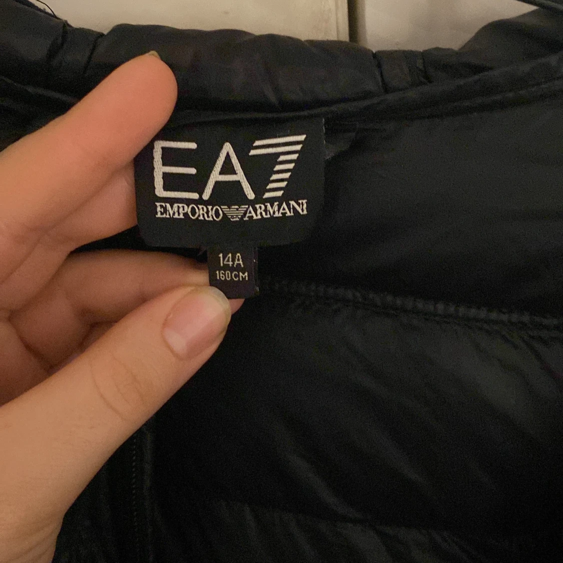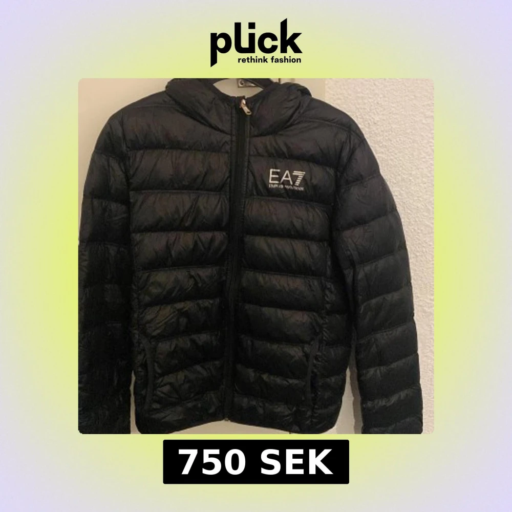 Snygg svart dunjacka från Emporio Armani EA7 med huva och dragkedja framtill. Perfekt för kyliga dagar med sin stilrena design och bekväma passform.