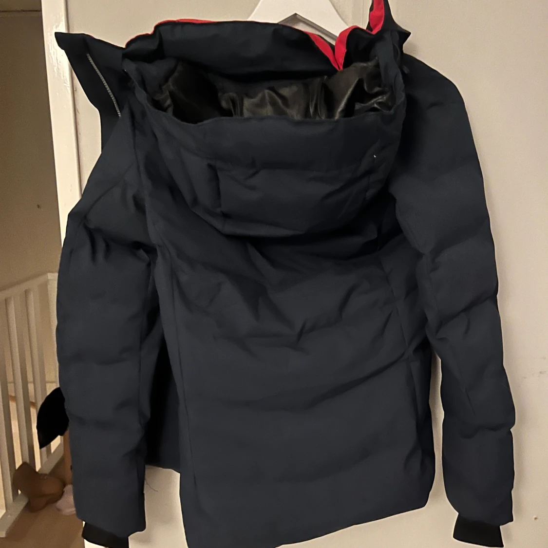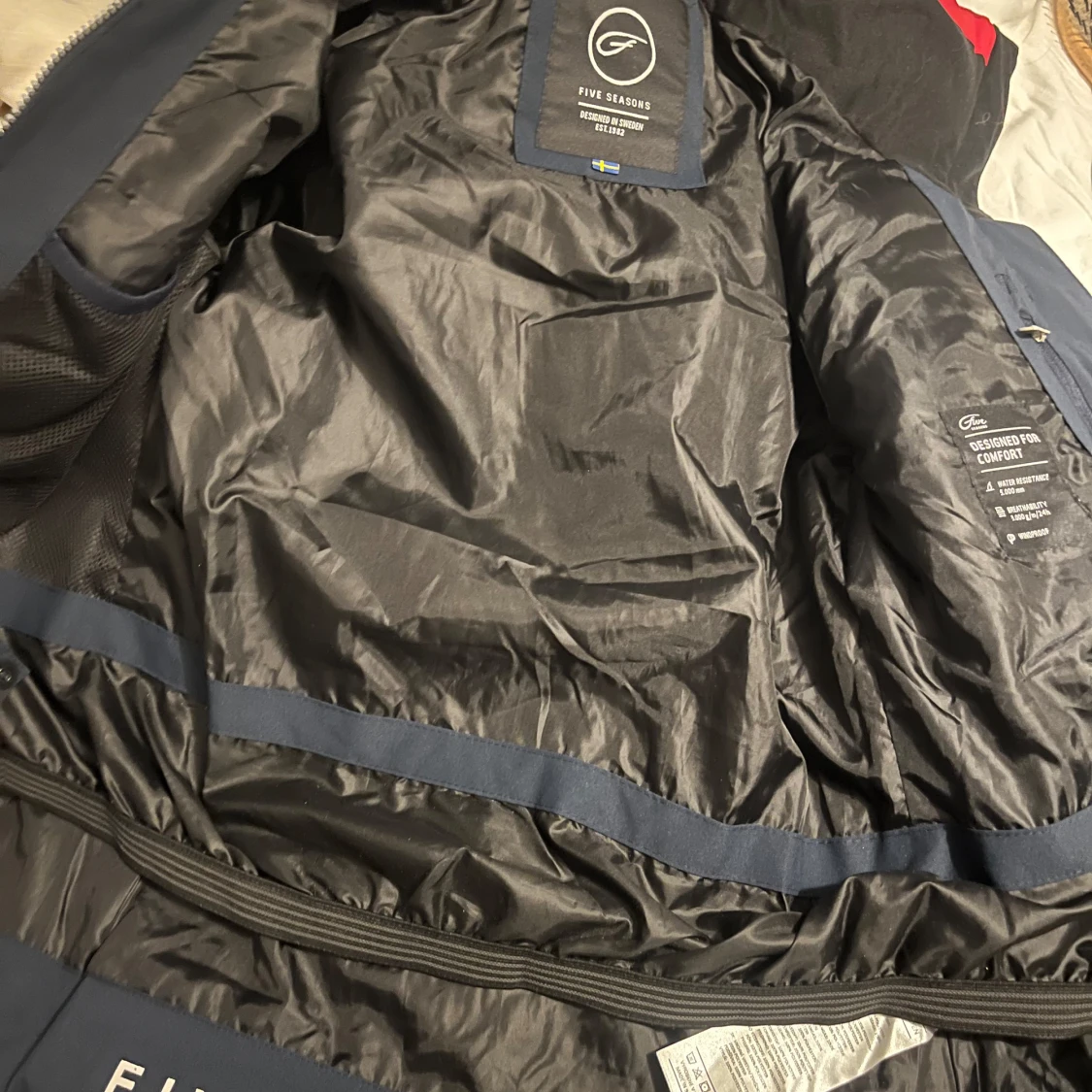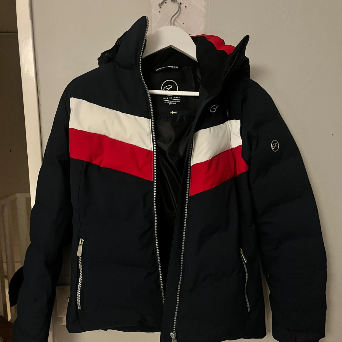 Säljer en mörkblå dunjacka från Five Seasons med röd och vit rand över bröstet. Använd 1 gång och är i jätte fint skick!