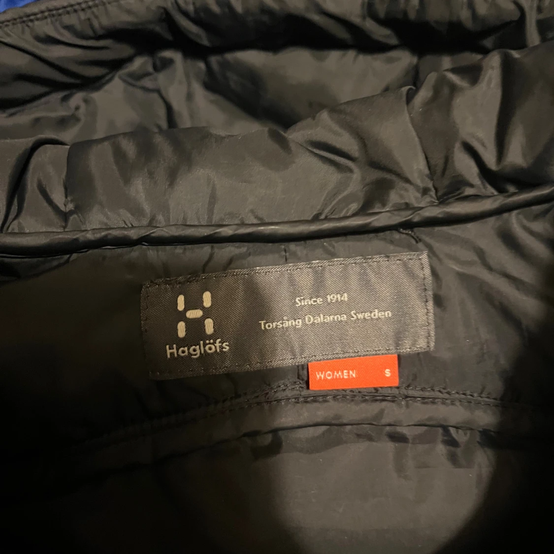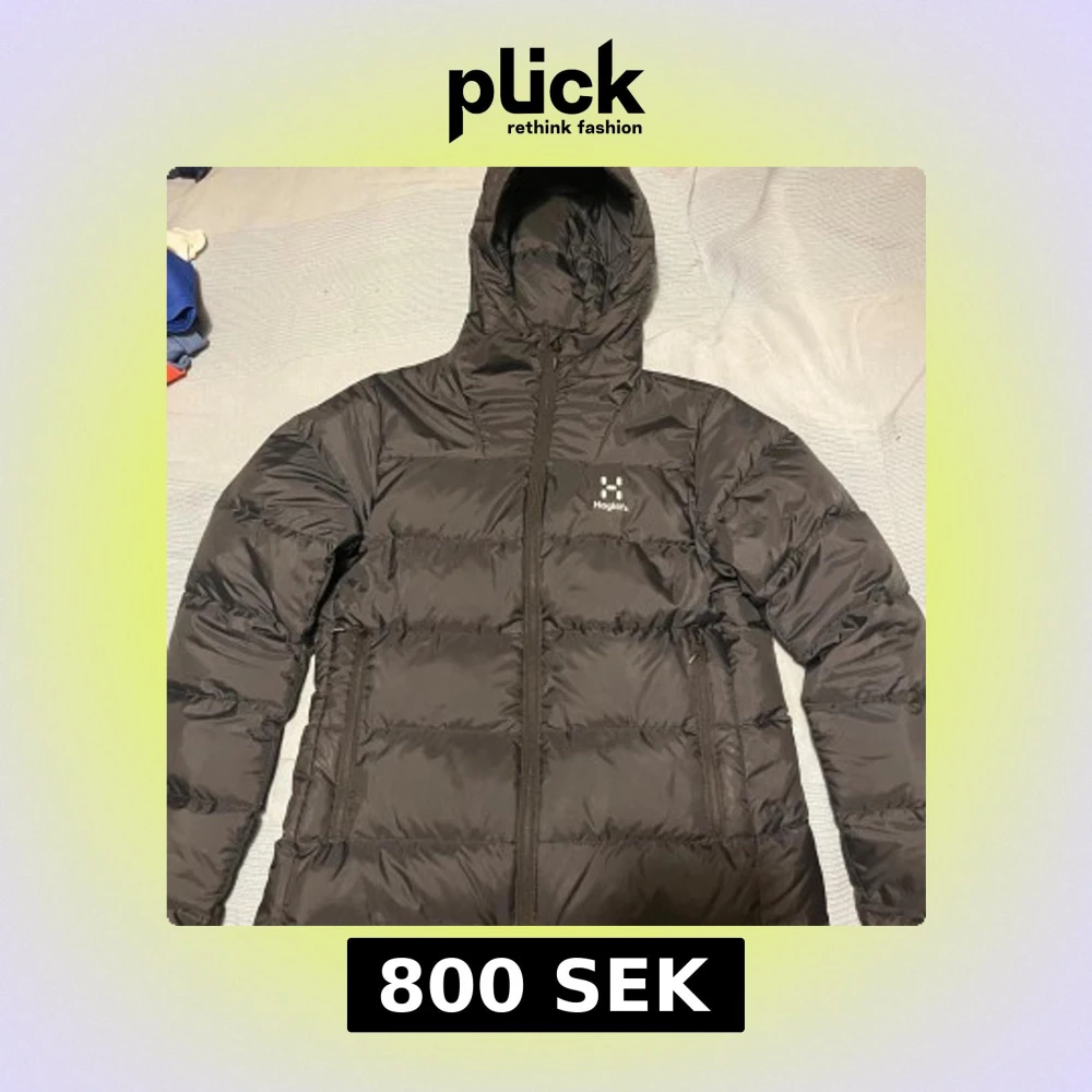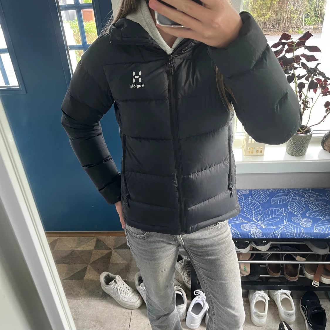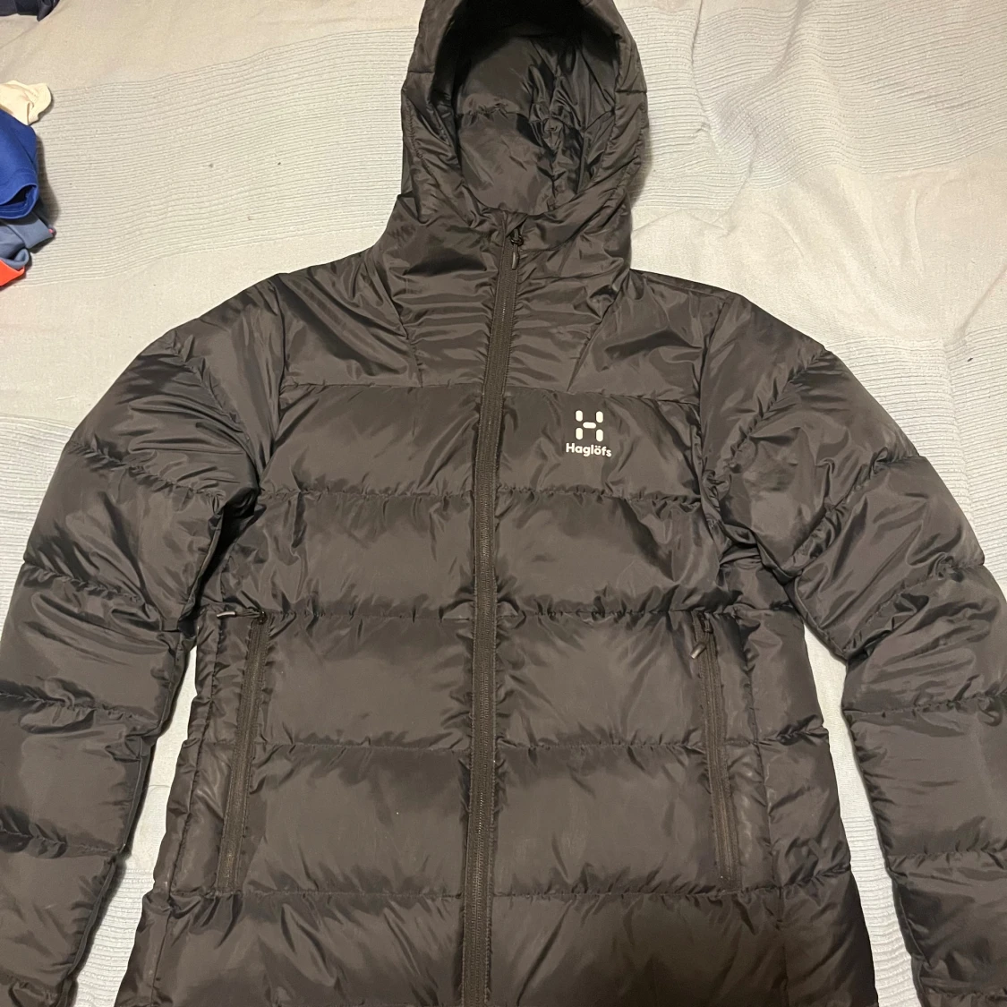 Säljer en svart dunjacka från Haglöfs med huva och dragkedja framtill. Jackan är vadderad och har en clean look med diskret logga på bröstet. Perfekt för kalla dagar när du vill hålla värmen och ändå se snygg ut.