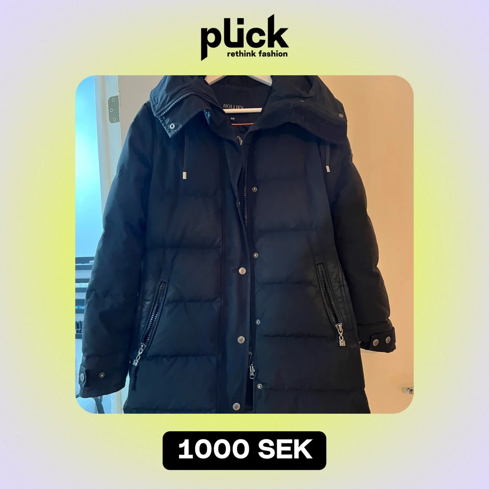 Säljer en snygg och varm svart dunjacka från Hollies i storlek 34. Jackan har en stilren design med dragkedjor och knappar framtill. Perfekt för kalla vinterdagar med sin långa ärm och pufferstil. Den har också en praktisk huva för extra skydd mot väder och vind. Lite glansig vid fikan men inget som märks så mycket finns ingen päls därav priset! Priset går o diskutera vid snabb affär