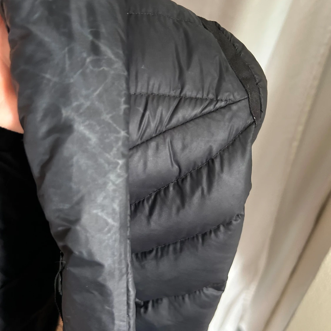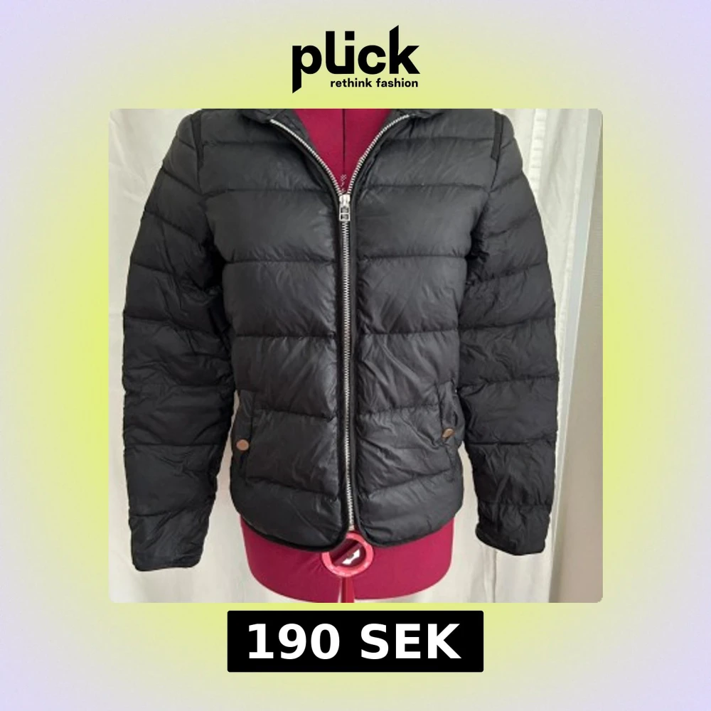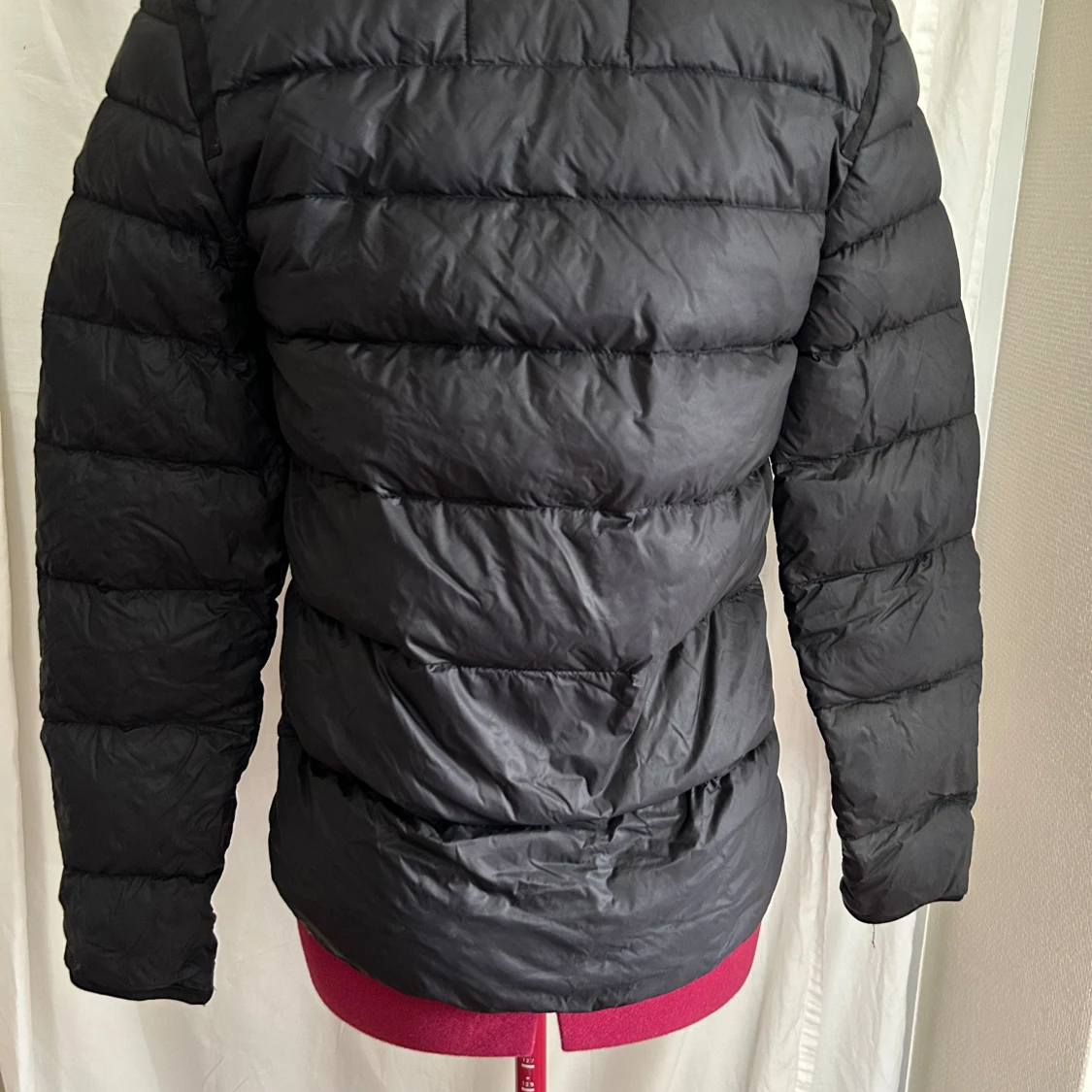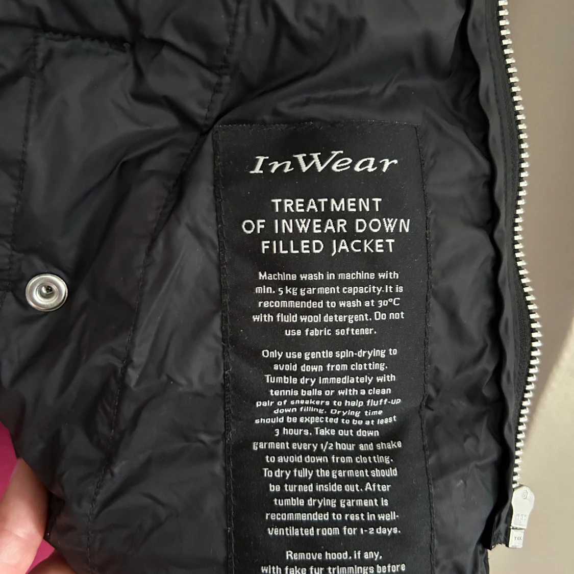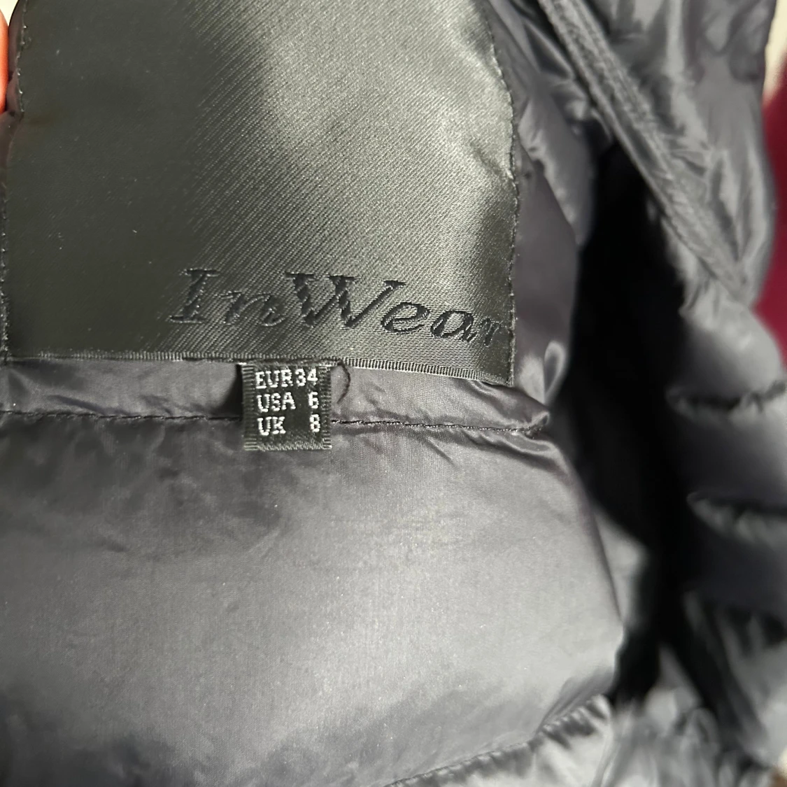 Snygg svart dunjacka från InWear i storlek 34. Jackan är quiltad med horisontella sömmar, har dragkedja framtill och två fickor med tryckknapp. På insidan av kragen syns tecken på användning (se bild 5)