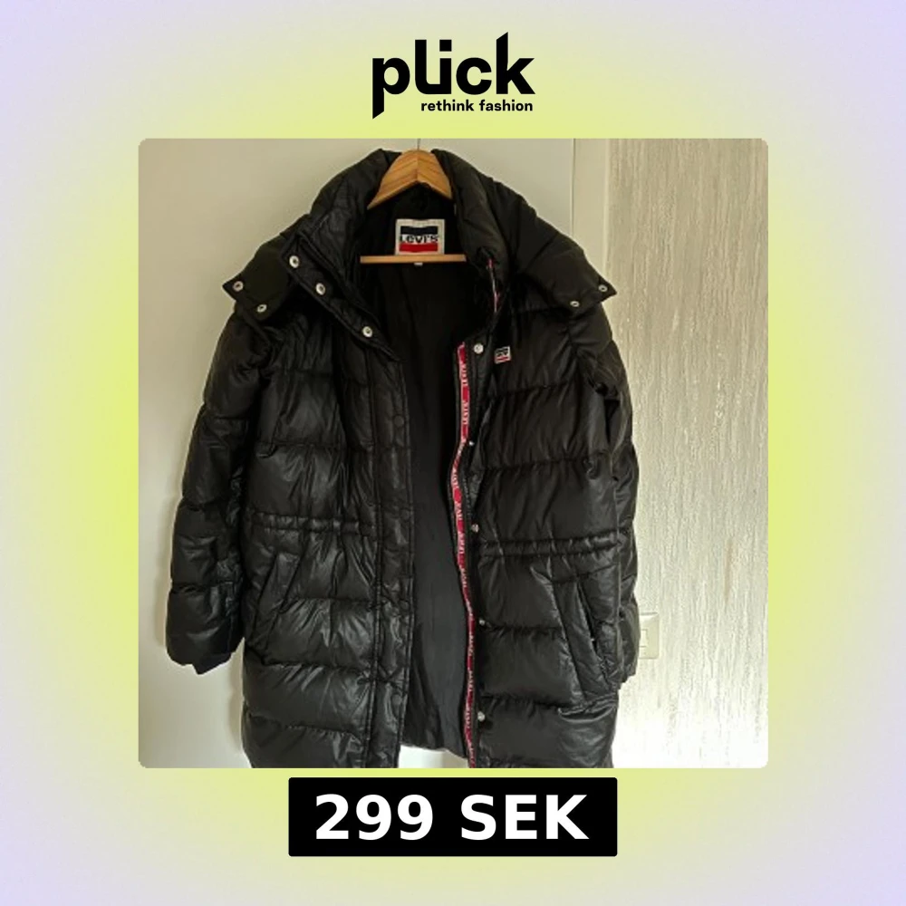 Säljer en svart dunjacka från Levi's i storlek XS. Jackan har en pufferdesign med långa ärmar och en praktisk huva. Den har en dragkedja framtill och är perfekt för kyligare väder. Levi's-loggan syns på insidan och längs dragkedjan.