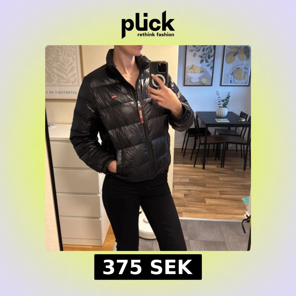 Snygg svart dunjacka från Levi's med glansig finish och klassisk pufferstil. Jackan har dragkedja framtill, hög krage och Levi's-logga på bröstet. Vattenavvisande material och värmande dunfyllning gör den perfekt för kyliga dagar nu när hösten kommit. Medföljer även en liten ”påse” där man kan stoppa in jackan i så den knappt tar någon plats alls! Därav att jackan kanske ser lite skrynklig ut, då jag precis tog ut jackan ur påsen! ☺️ Den är i finfint skick! Pris kan diskuteras vid snabb affär!