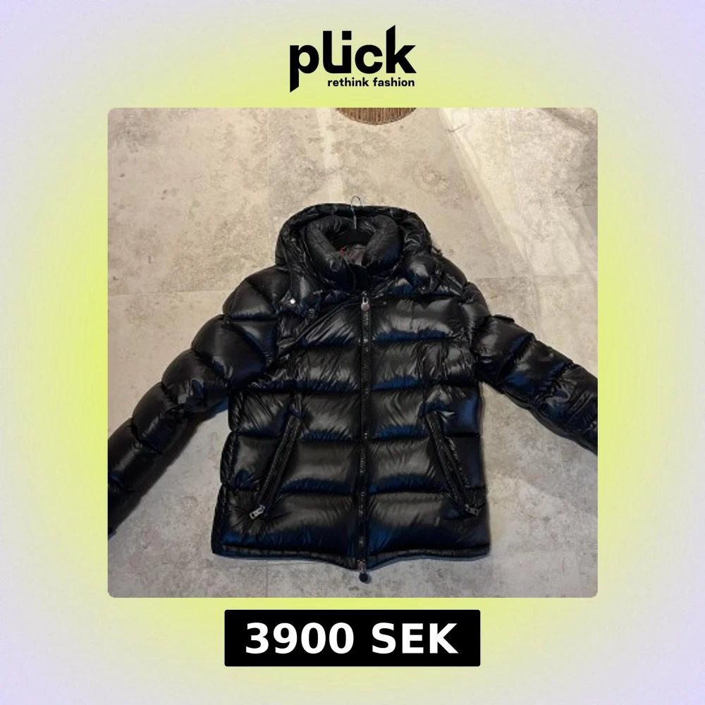 Säljer en svart, glansig dunjacka från Moncler med huva och dragkedja framtill. Jackan har två snedställda fickor med dragkedja och klassisk Moncler-logga på ärmen. Perfekt för kalla dagar.