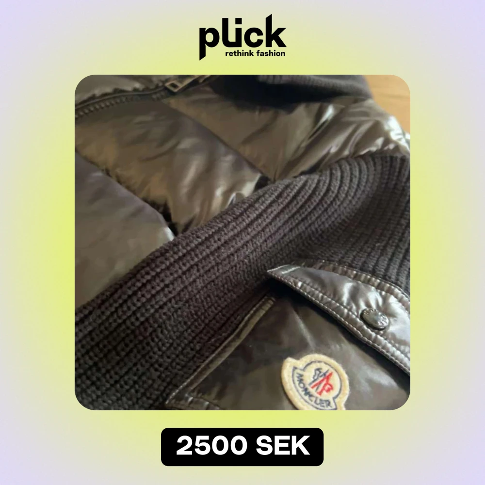 Säljer en snygg svart dunjacka från Moncler. Jackan har en glansig finish med stickade detaljer och en dragkedja framtill. Perfekt för kyliga dagar när du vill hålla stilen. Moncler-loggan syns tydligt på ärmen. Passar både till vardags och lite finare tillfällen.
