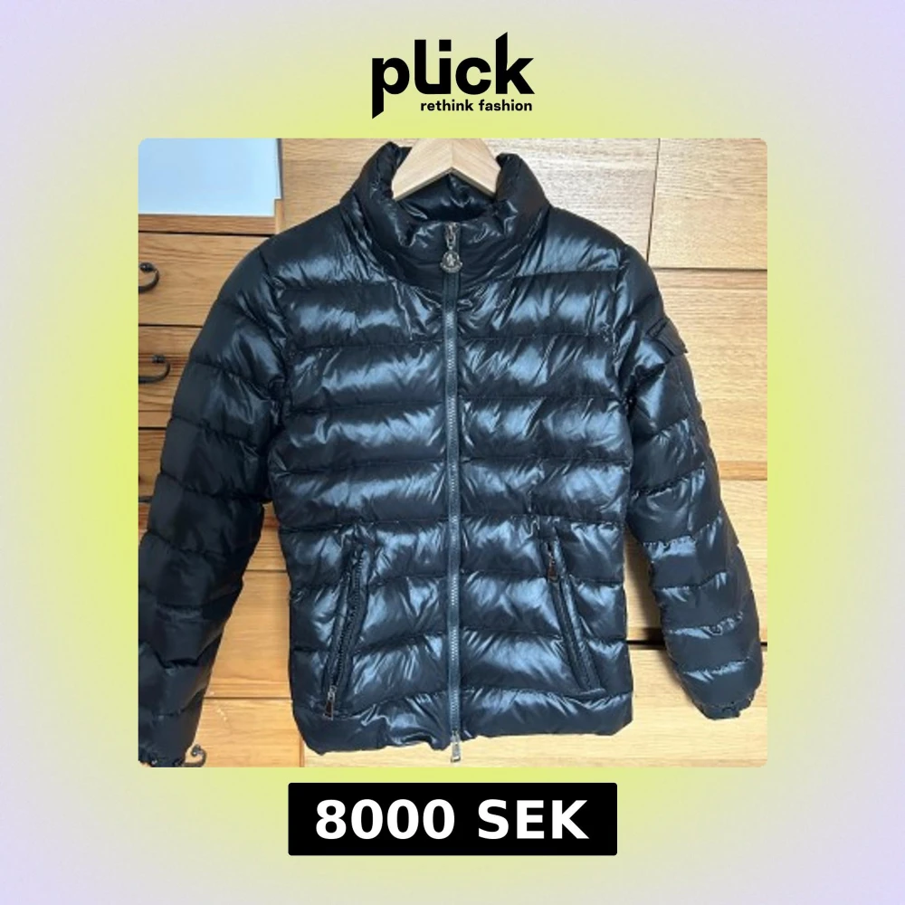 Snygg svart dunjacka från Moncler med dragkedja och hög krage. Jackan har långa ärmar och två fickor med dragkedja framtill. Perfekt för kyligare dagar.