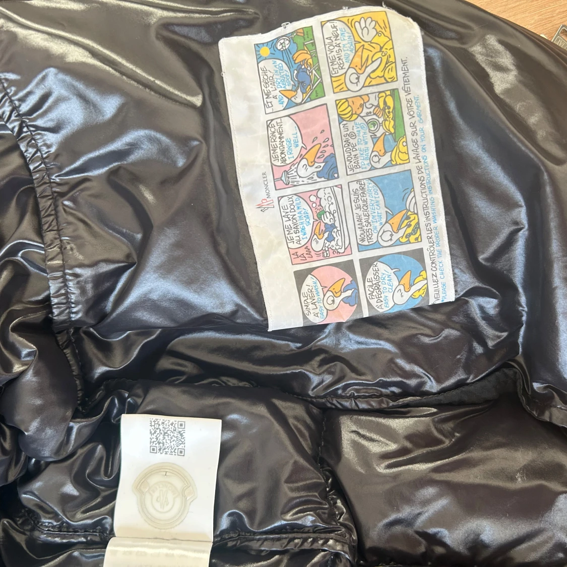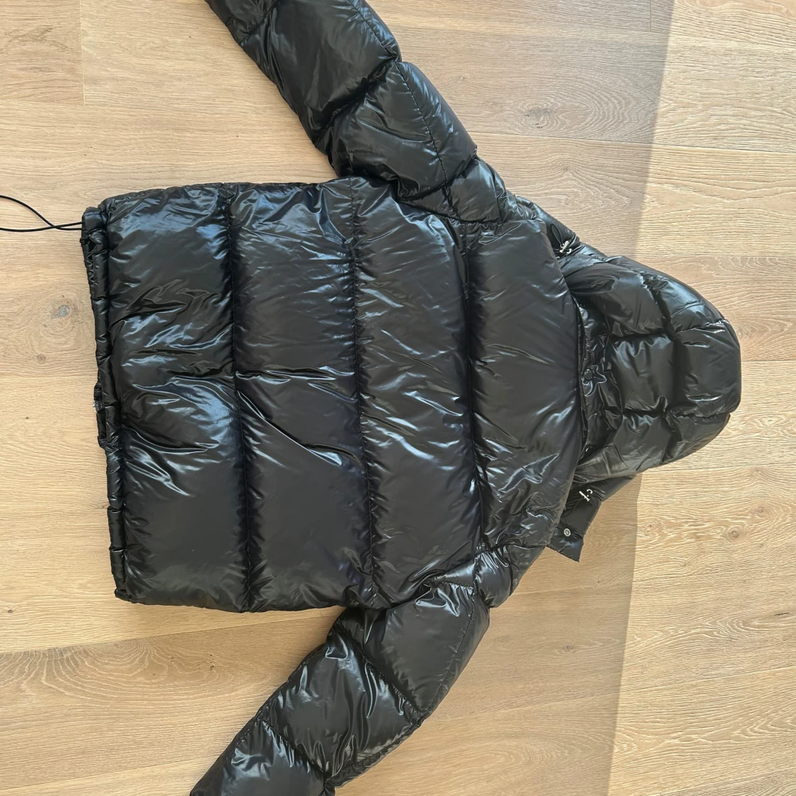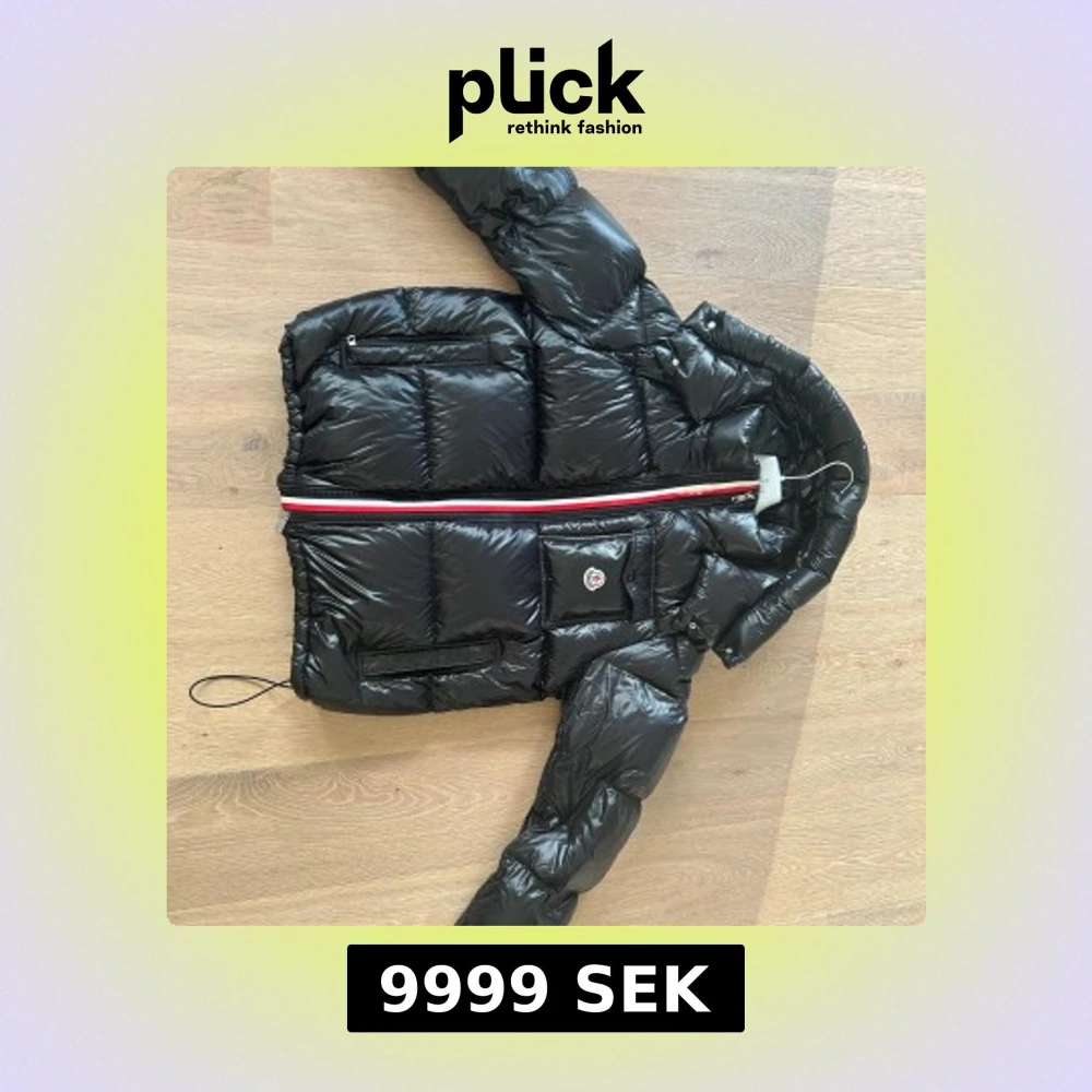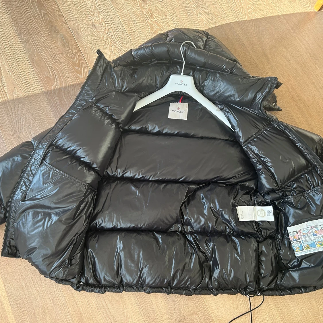 Snygg svart dunjacka från Moncler med en iögonfallande röd och vit dragkedja. Jackan har en quiltad design och en praktisk huva. Perfekt för kyliga dagar! Det är ett litet slitage på en av ränderna.