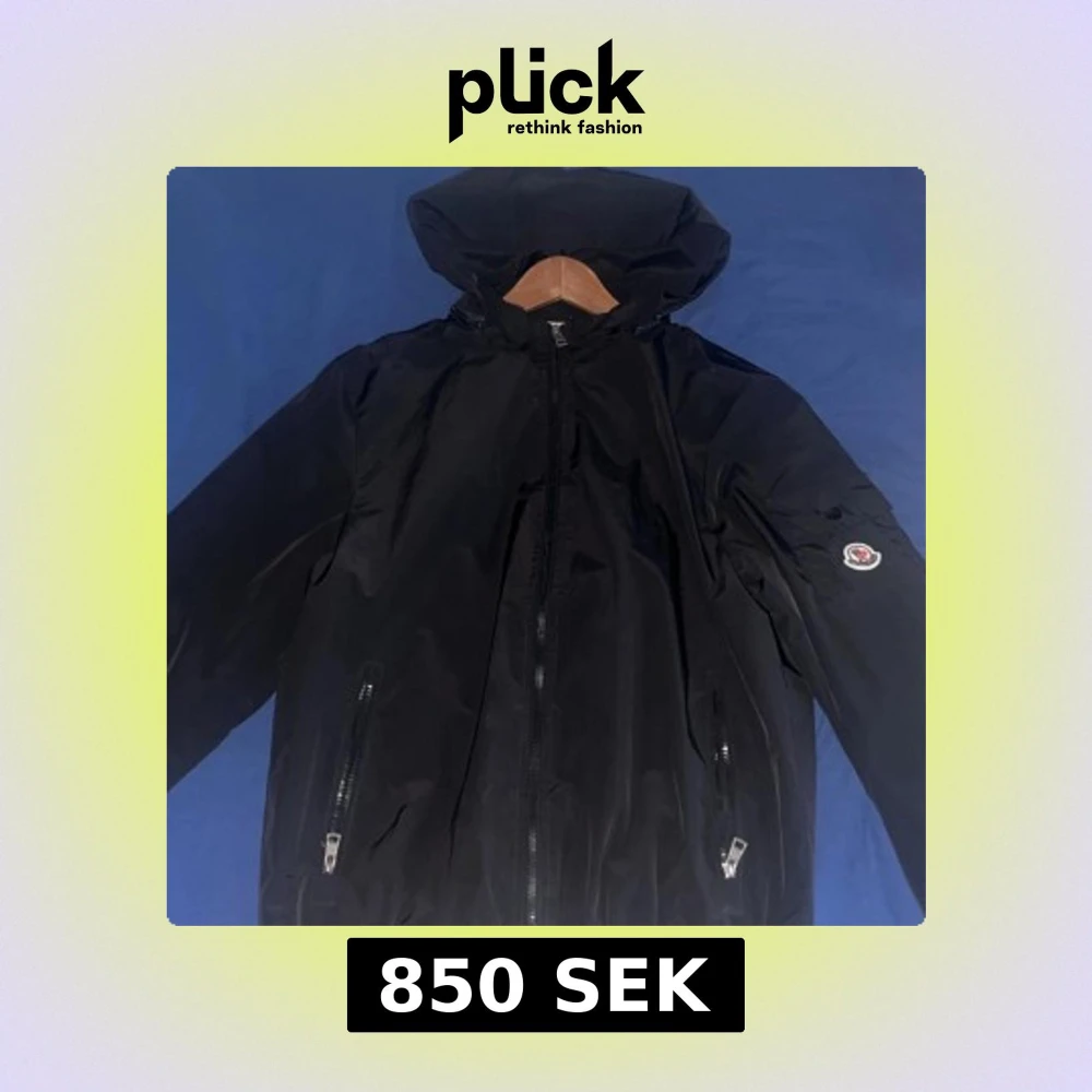 Svart Moncler dunjacka med huva och två dragkedjeförsedda fickor framtill. Jackan har Moncler-logga på ärmen och en extra ficka med knapp. Stilren design och perfekt för kalla dagar. Jackan är lätt och har en snygg passform.