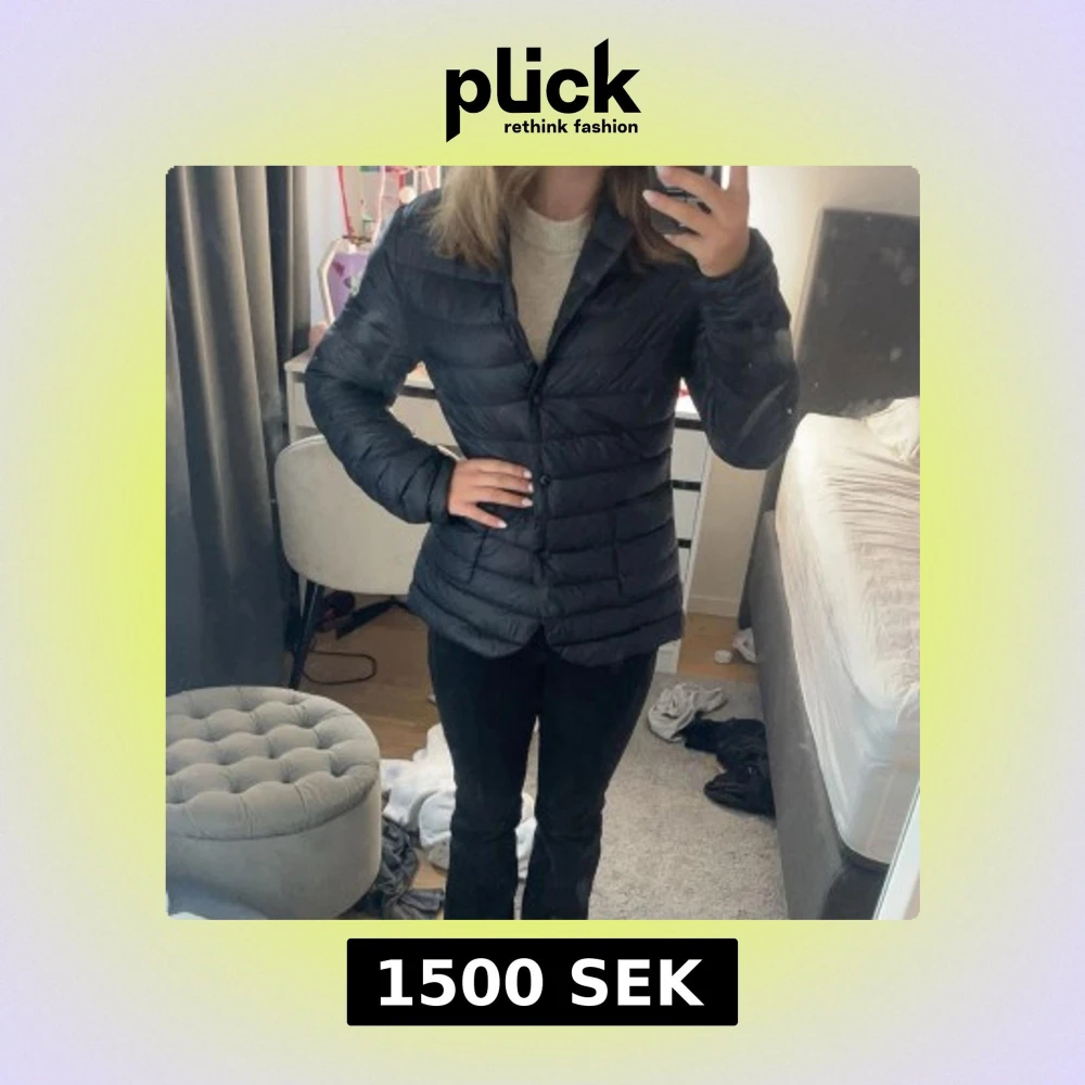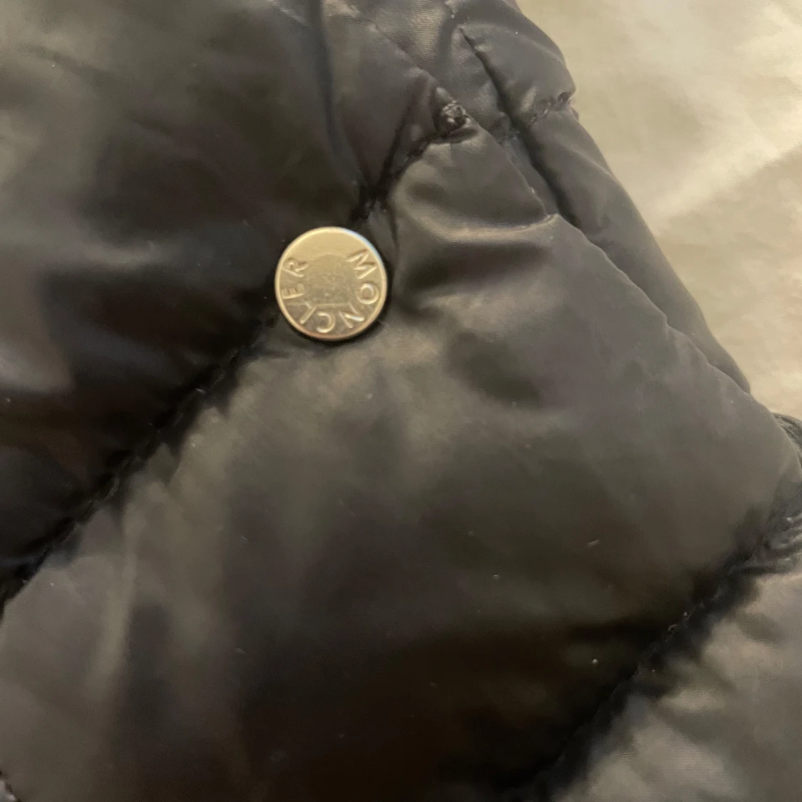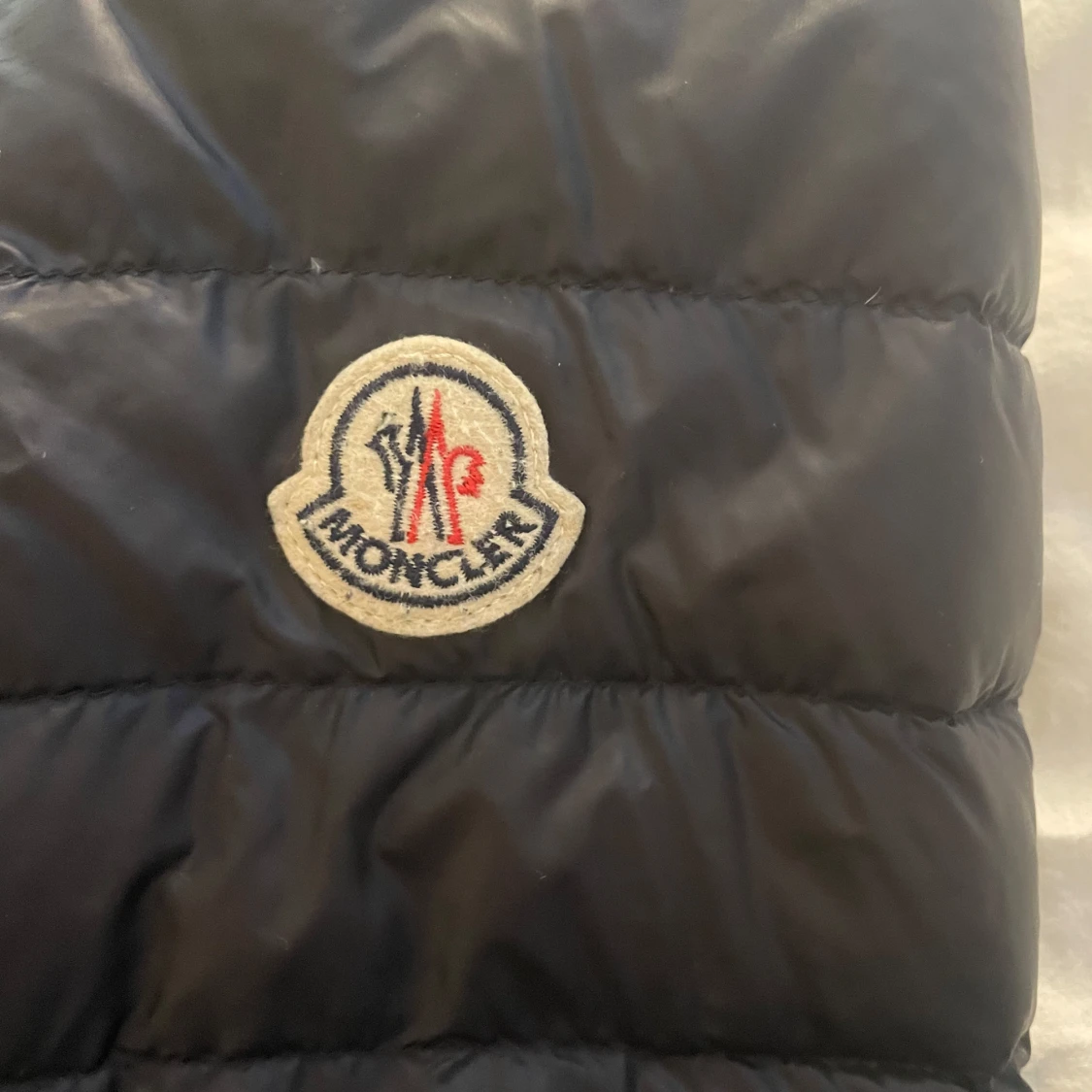Säljer en marinblå dunjacka från Moncler med klassisk design och knappar framtill. Jackan har Moncler-logga på armen.