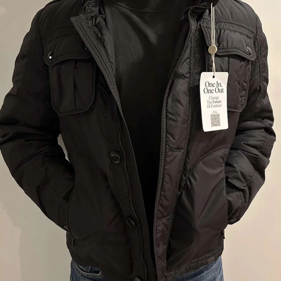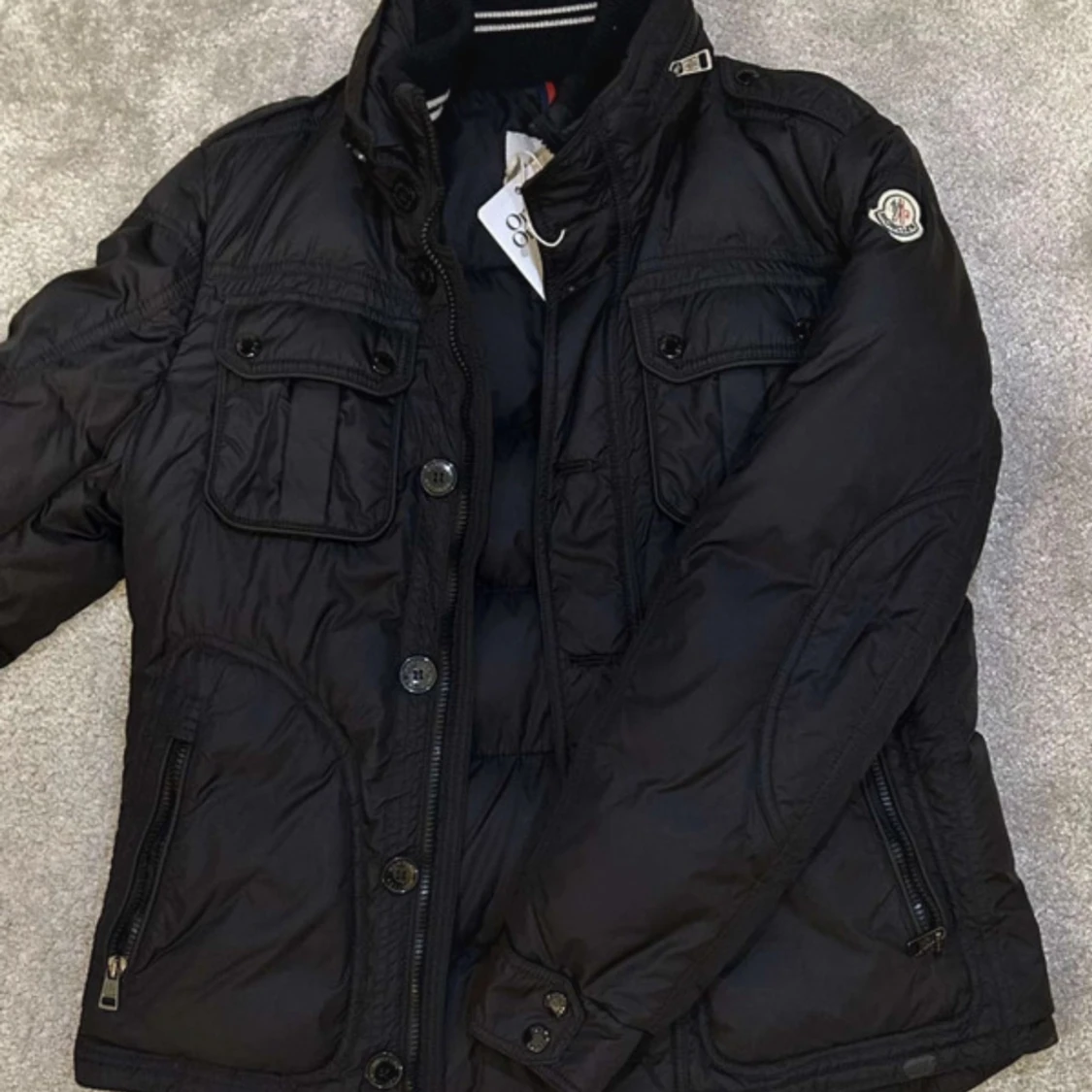 Säljer en stilren svart dunjacka från Moncler. Jackan har en dragkedja och knappar framtill samt praktiska fickor med lock. Perfekt för kyligare dagar med sin varma och bekväma design. Storlek 2- M