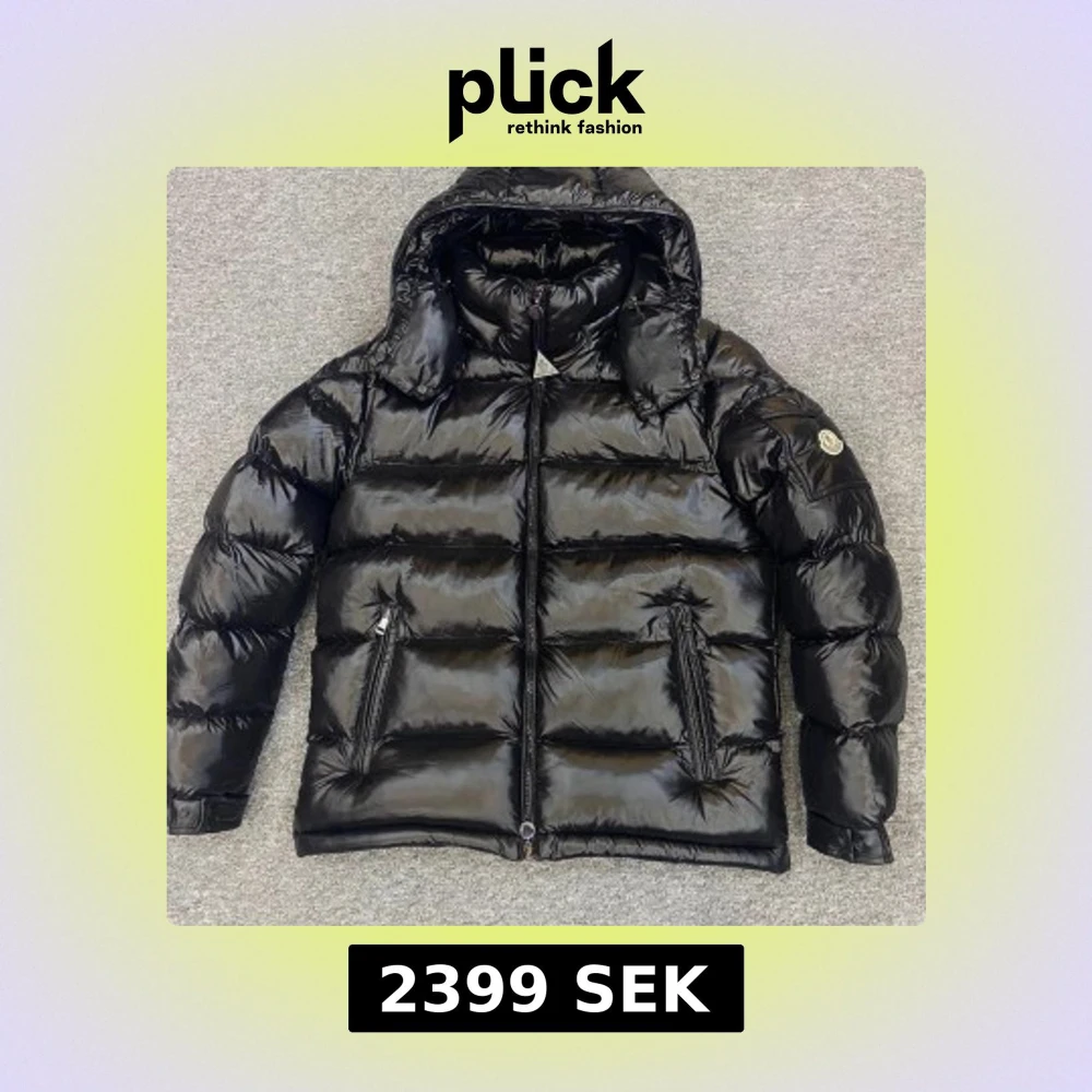 Snygg svart dunjacka från Moncler med huva och dragkedja. Jackan har en glansig finish och två praktiska fickor med dragkedjor. Perfekt för kyliga dagar.