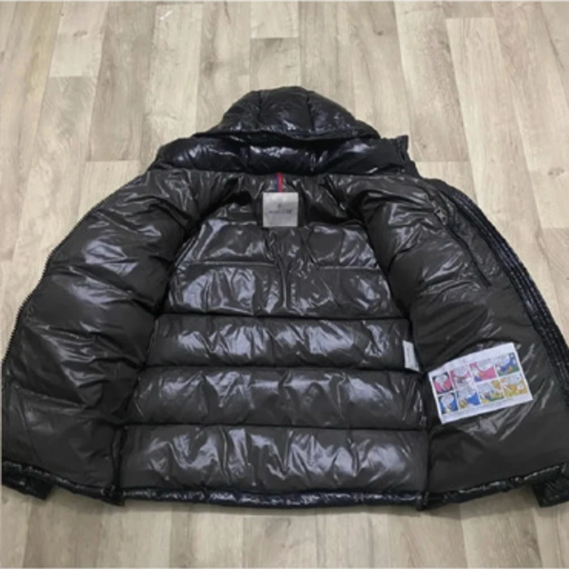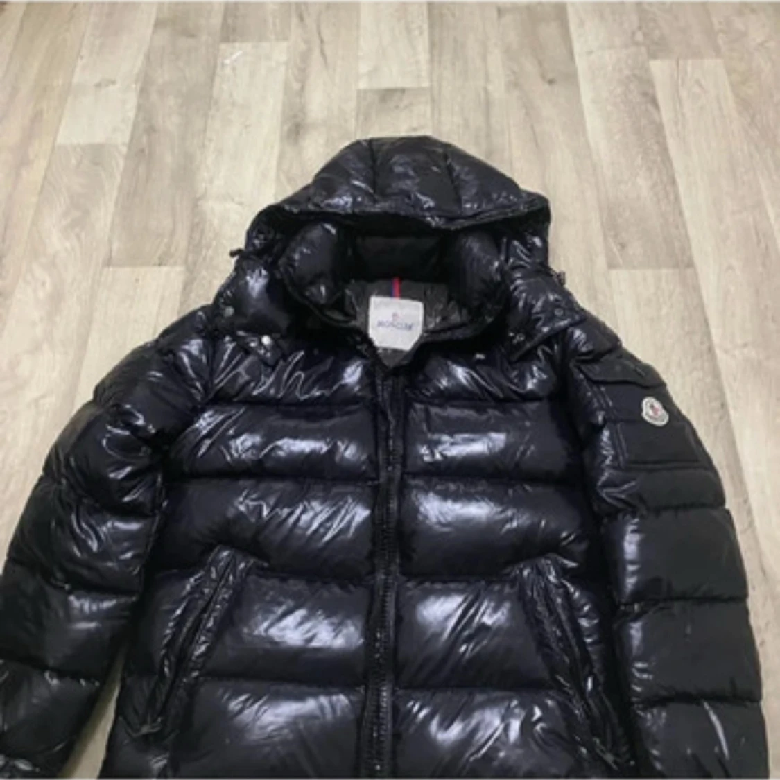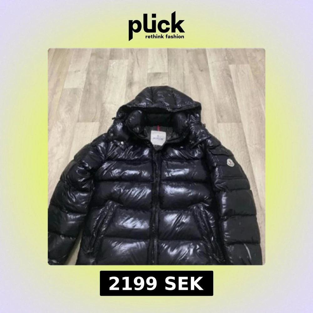 Säljer en svart, glansig dunjacka från Moncler med huva och dragkedja. Jackan har klassisk pufferstil, två fickor med dragkedja och Moncler-logga på ärmen. Perfekt för kalla dagar och riktigt snygg streetstil.