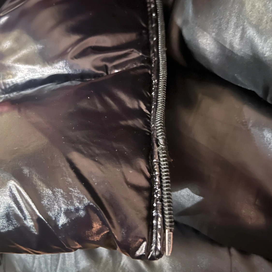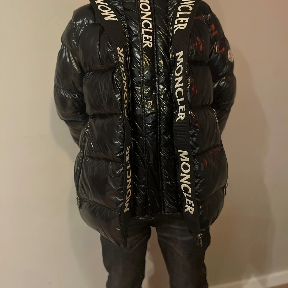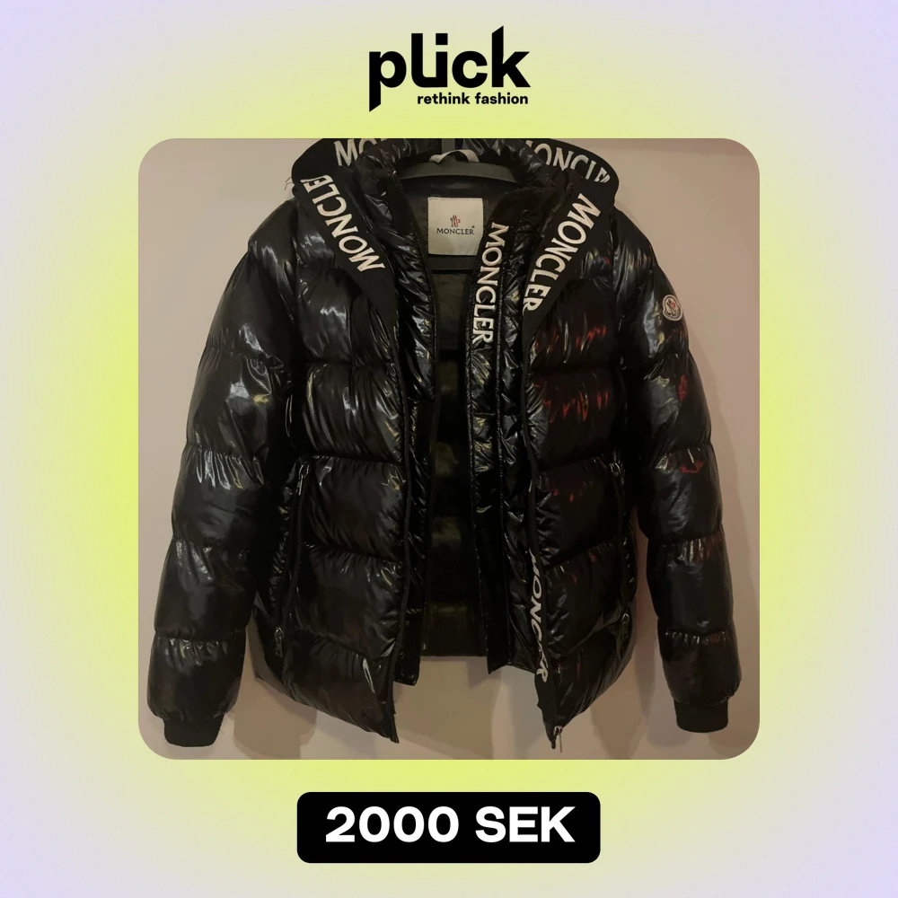 Säljer en snygg svart dunjacka från Moncler i bra skick. Jackan har en glansig finish och Moncler-logga på vänster ärm. Den är långärmad med dragkedja och har coola Moncler-band längs med dragkedjan. Perfekt för vintern! Den har två dragkedjor varav ena låter märket MONCLER synas längst med. Den yttre dragkedjan har en liten skada längst ner, påverkar inte funktionen märkbart. Serien på insidan har lossnat något.