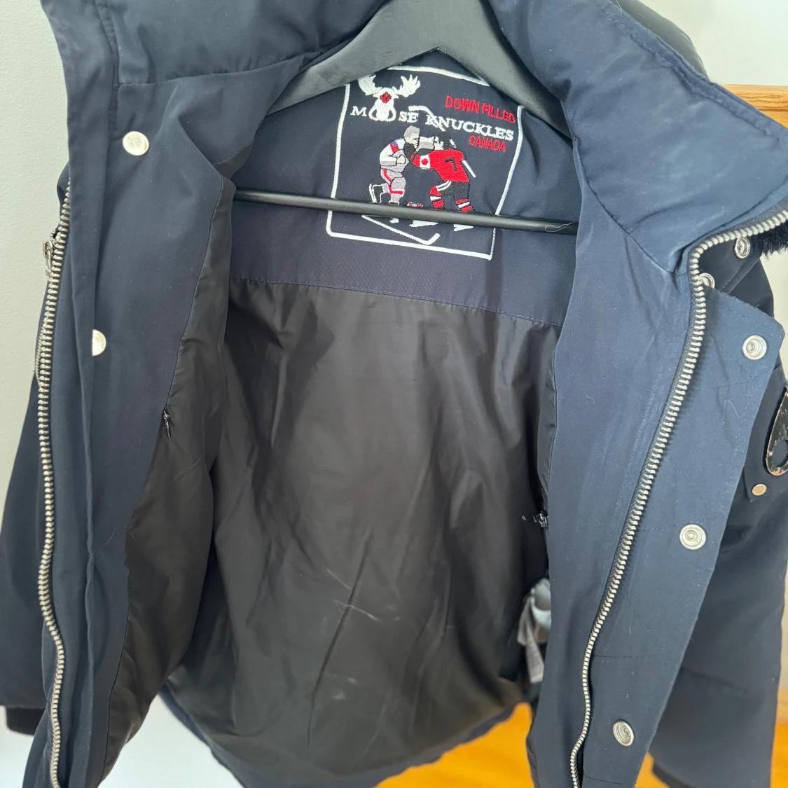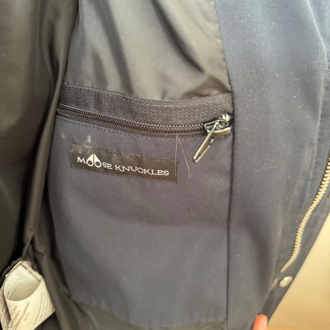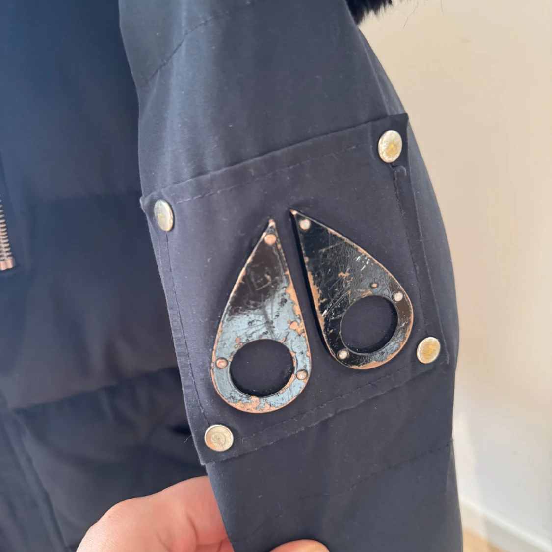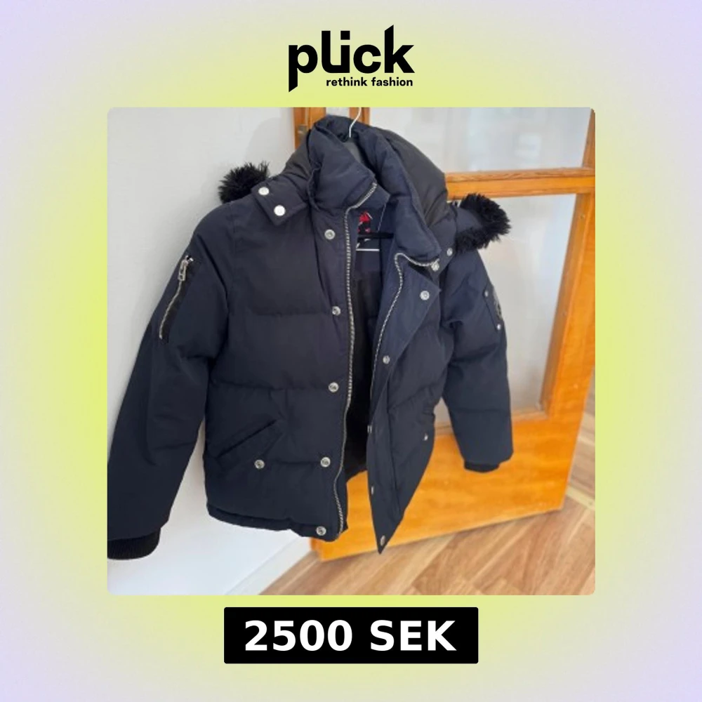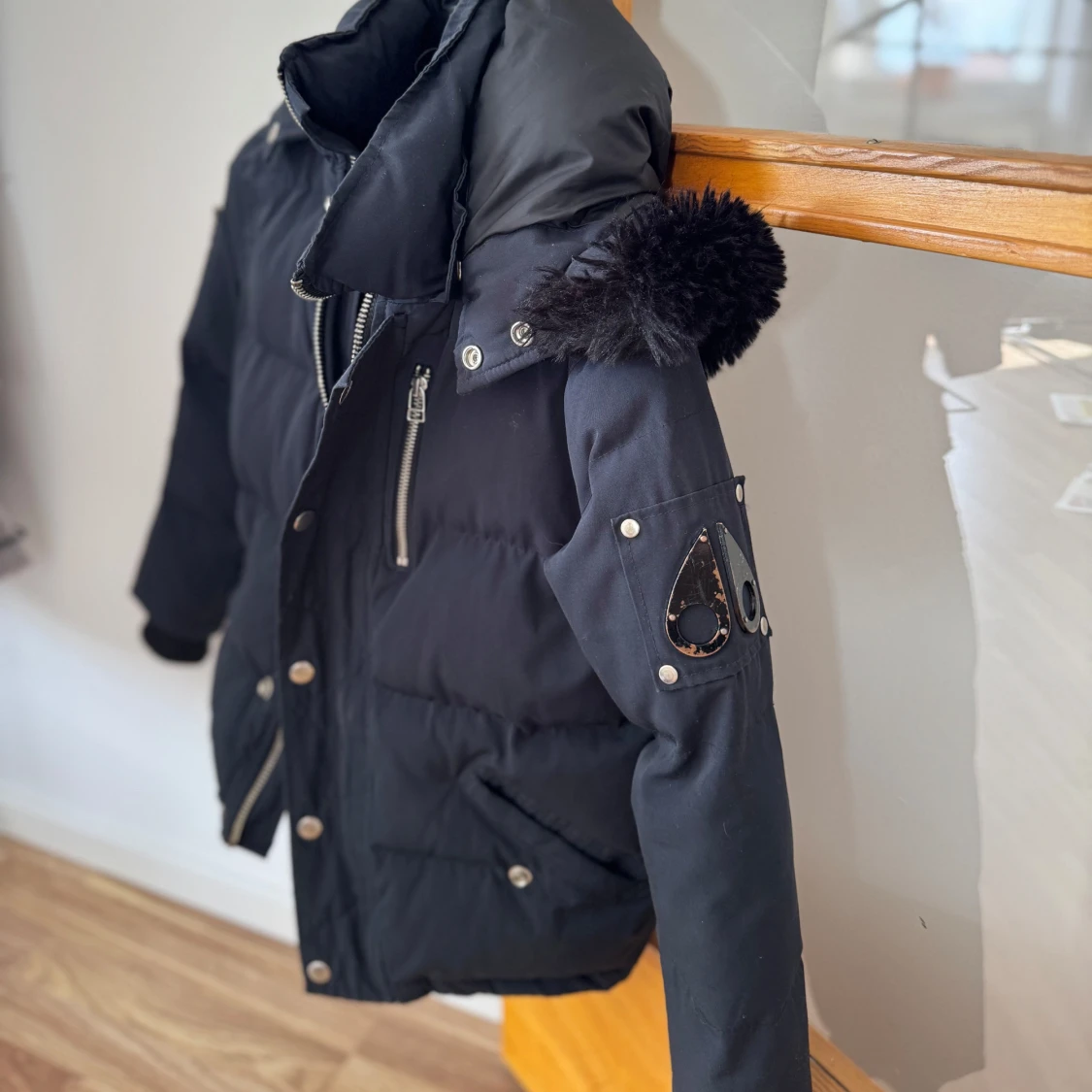 (Pris kan diskuteras) Säljer en svart dunjacka från Moose Knuckles med pälskantad huva och silvriga dragkedjor. Jackan har flera fickor med tryckknappar och dragkedjor samt ribbade muddar vid ärmslut. Perfekt för kyliga dagar. Jack är då väll använd och därför slitningar på märket, jag säljer denna nu efter som den är alldeles för lite för mig. Storlek är XS.