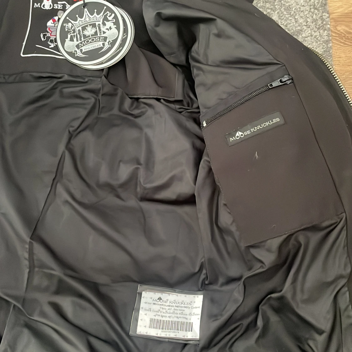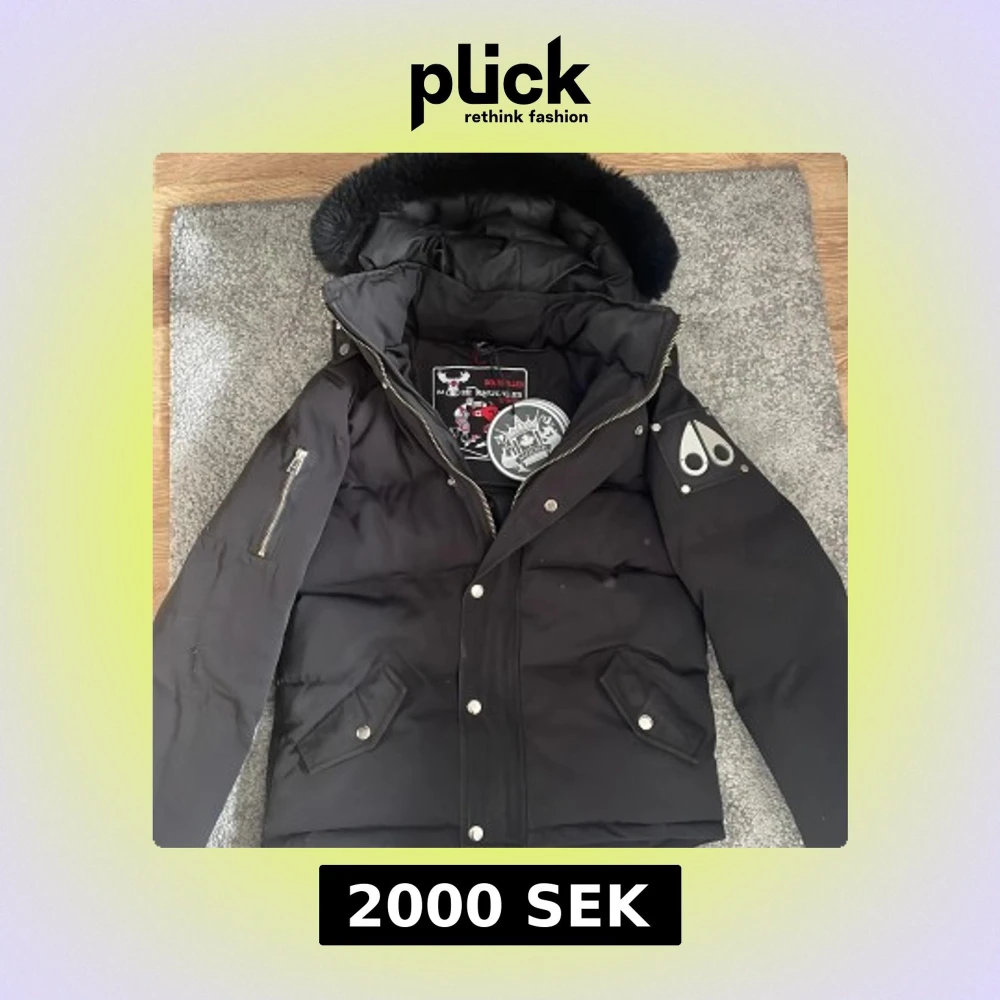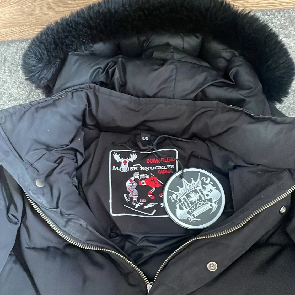 Säljer en svart dunjacka från Moose Knuckles med pälskantad huva och dragkedja. Jackan har långa ärmar och flera fickor med knappar. Perfekt för kalla dagar med stil. 🖤