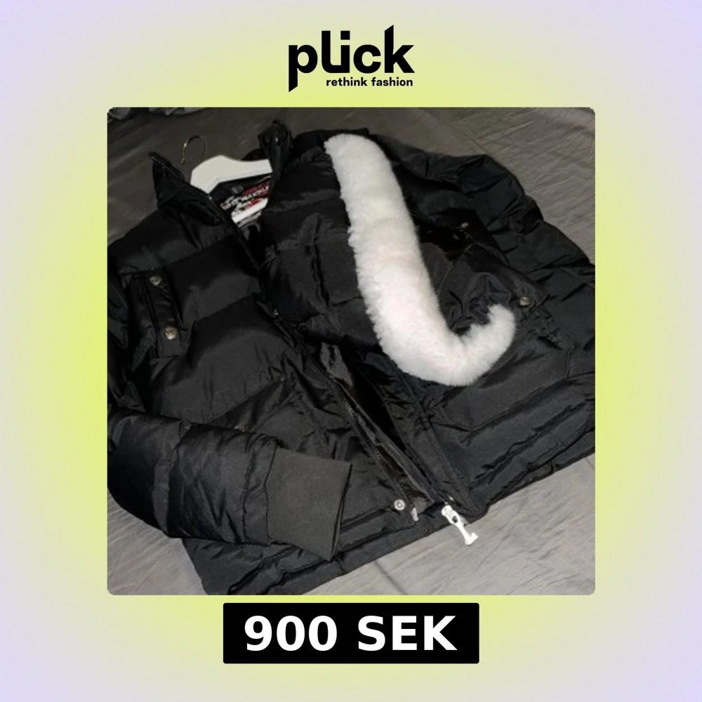Säljer en svart dunjacka från Moose Knuckles med fluffig vit fuskpäls på insidan av luvan. Jackan har dragkedja, tryckknappar och ribbade muddar vid ärmsluten. Perfekt för kalla dagar och riktigt snygg streetstil. Betala genom Swish