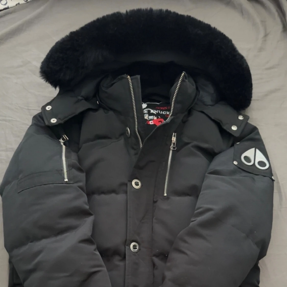 Säljer en svart dunjacka från Moose Knuckles med stor pälskantad huva, silverfärgade dragkedjor och knappar. Jackan har logga på ärmen och flera praktiska fickor. Perfekt för kalla dagar och riktigt snygg streetstil. Pris kan diskuteras.