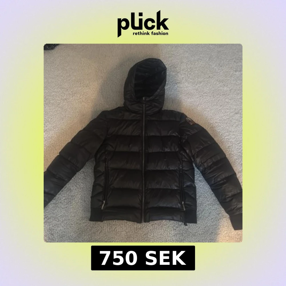 Säljer en snygg svart dunjacka från Parajumpers med huva och dragkedja. Jackan har en quiltad design och en logotyp på ärmen. Perfekt för kyliga dagar!