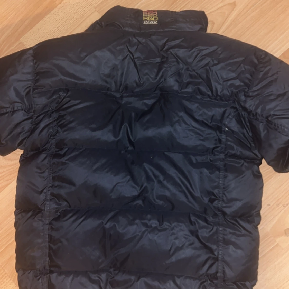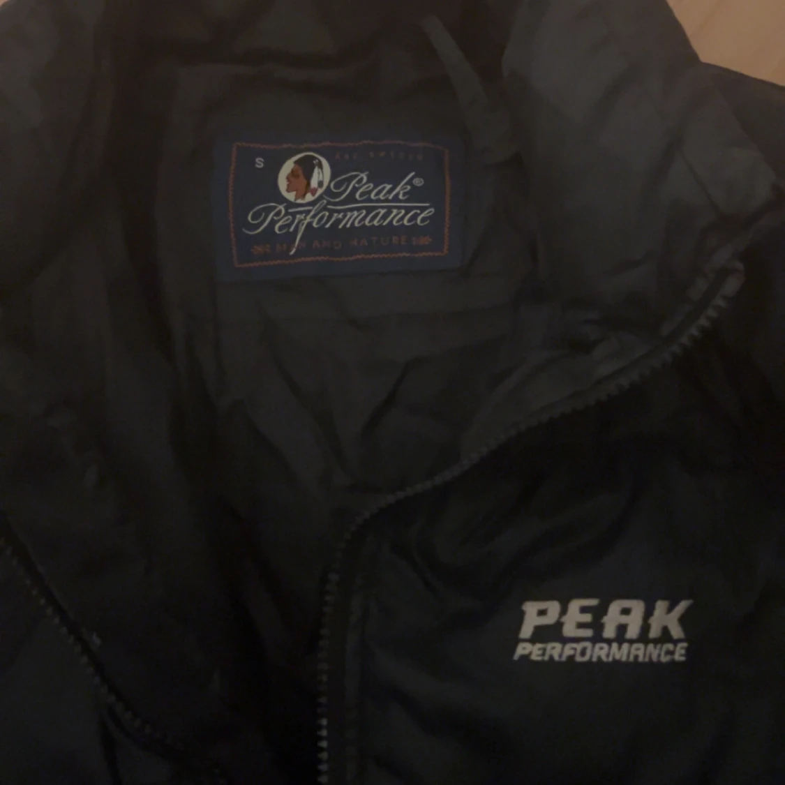 Säljer en svart dunjacka från Peak Performance. Jackan har en dragkedja framtill och är quiltad för extra värme. Perfekt för kyliga dagar. Har ett hål på höger arm som är lagat med en patch, sista bilden. Annars i använt skick