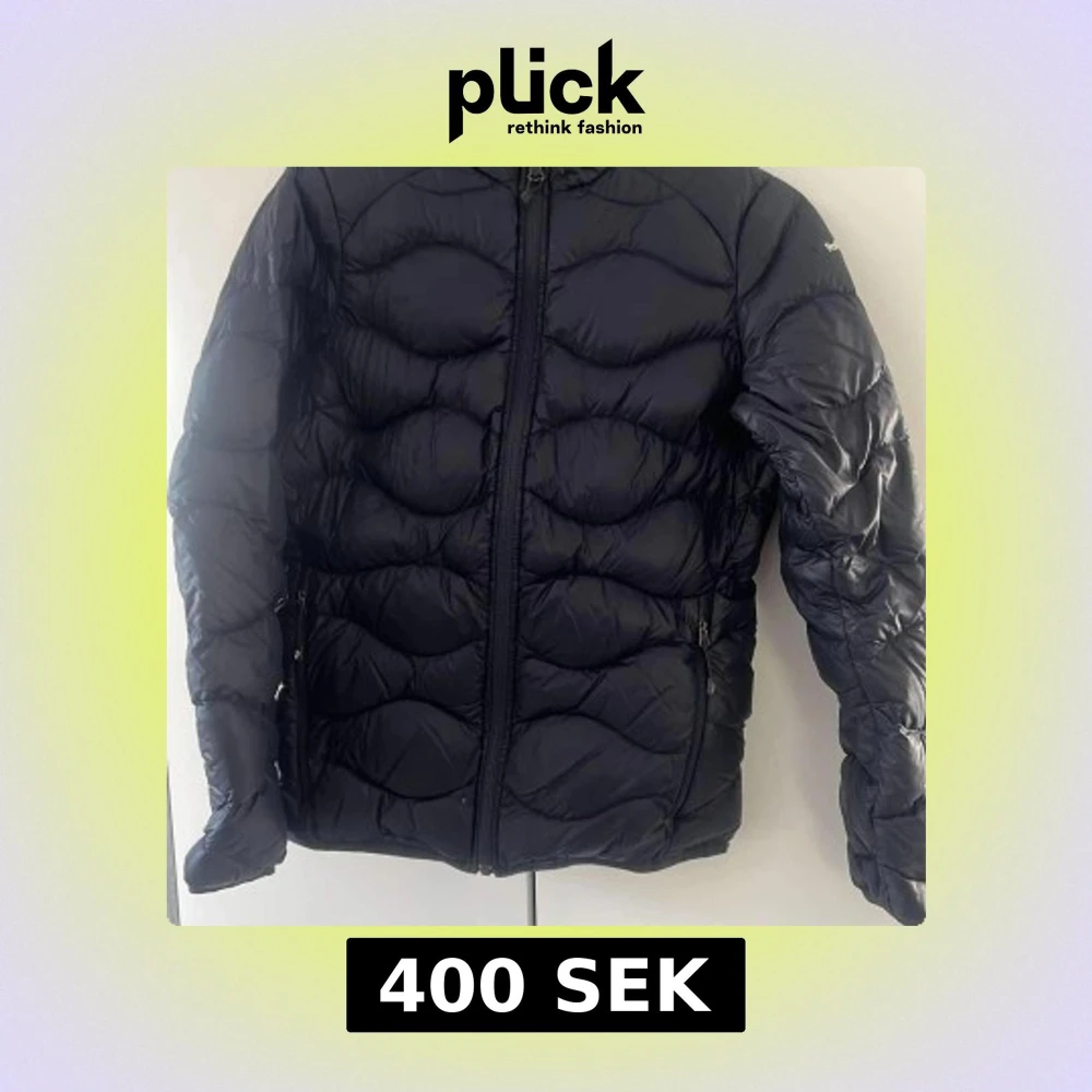 Snygg svart dunjacka från Peak Performance med quiltad design och dragkedja framtill. Jackan har långa ärmar och en hög krage med R&D-logga på baksidan. Perfekt för kyliga dagar. Finns en liten reva som är limmad bak. Se bild 3