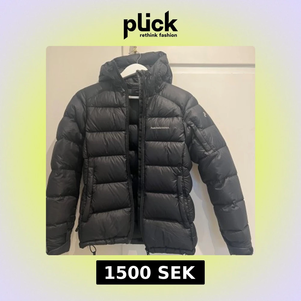 Säljer en svart dunjacka från Peak Performance med huva och dragkedja.