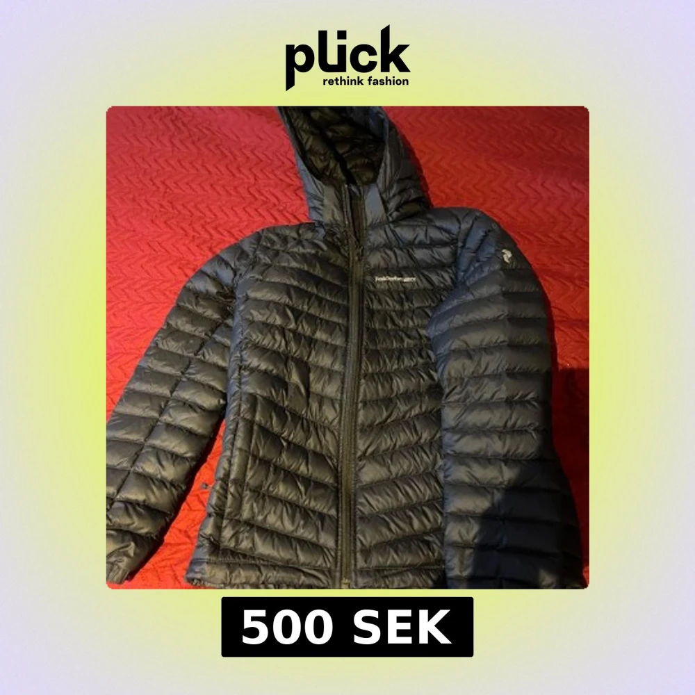 Säljer en svart dunjacka från Peak Performance med huva och dragkedja. Jackan är perfekt för kyliga dagar och har en stilren design med diskret logga på bröstet..