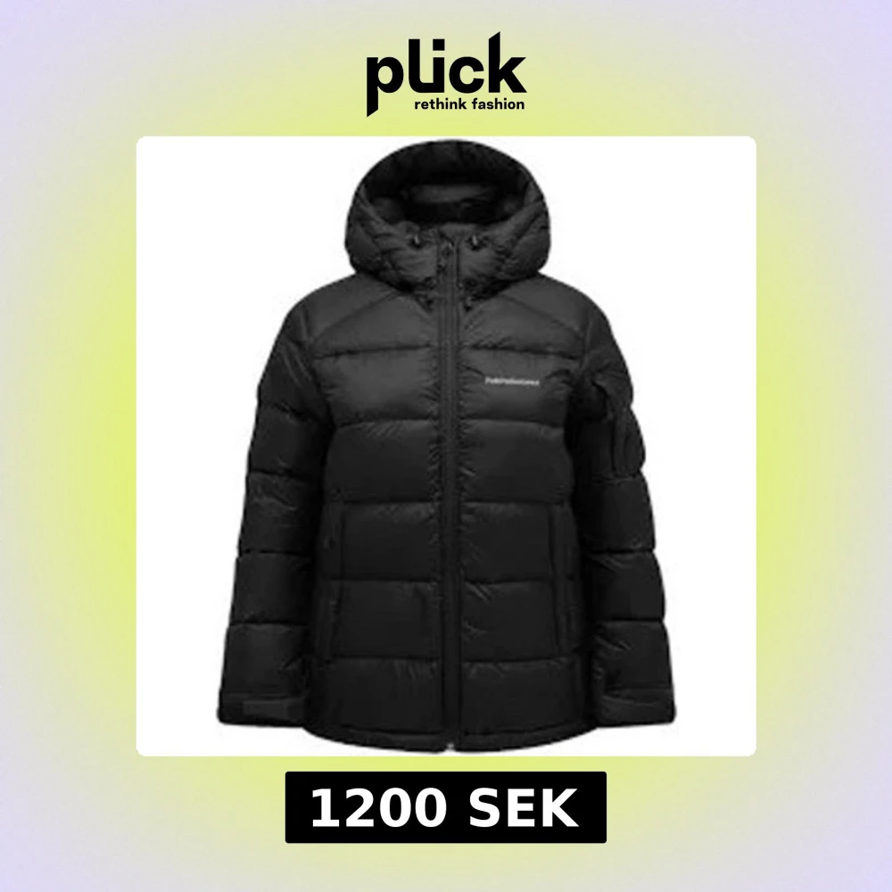 Säljer en svart dunjacka från Peak Performance med huva och dragkedja framtill. Jackan har en quiltad design och är perfekt för kalla dagar. Snygg, enkel och riktigt varm med klassisk look och diskret logga på bröstet.