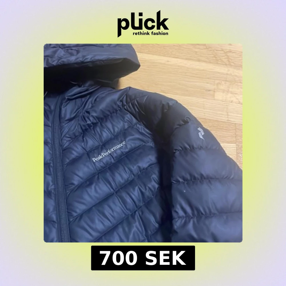 Säljer en svart dunjacka från Peak Performance med huva och dragkedja. Jackan är quiltad och har en stilren design, perfekt för kyliga dagar. Den är långärmad och har en diskret logga på bröstet.