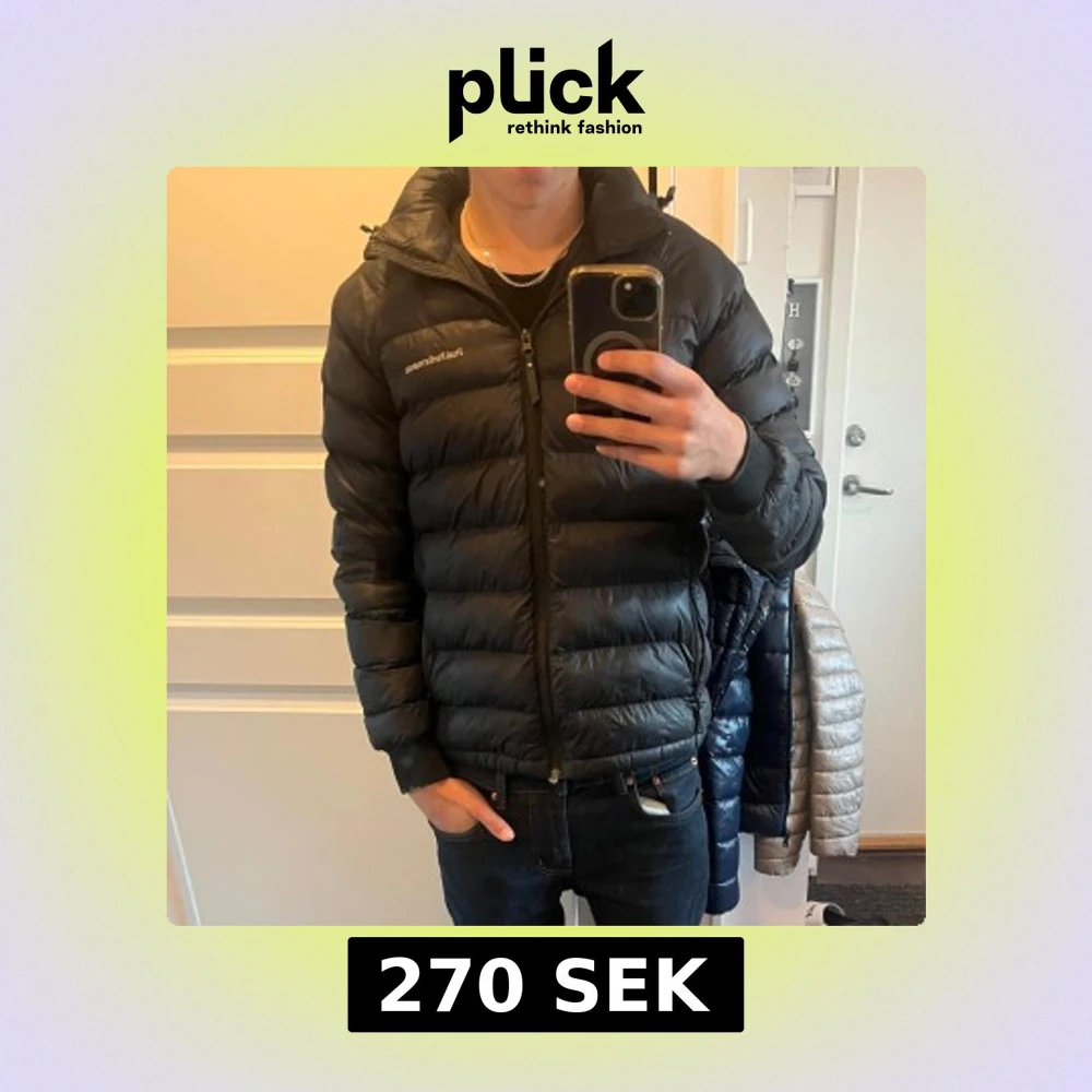 Svart dunjacka från Peak Performance med huva och dragkedja framtill. Perfekt för kalla dagar och har en clean, sportig look. Klassisk passform och diskret logga på bröstet. Den är tyvärr lite trasig på armbågen (se bild)