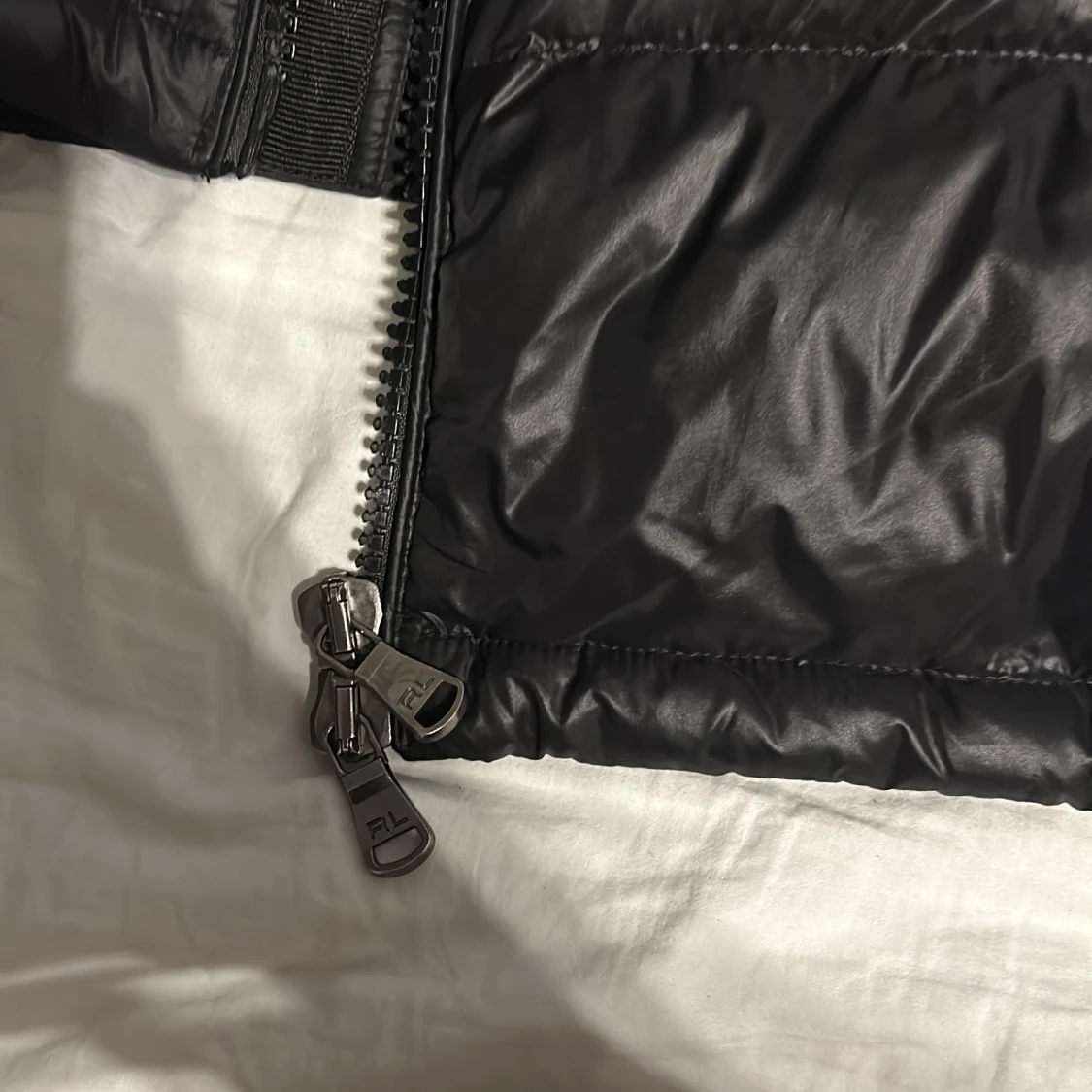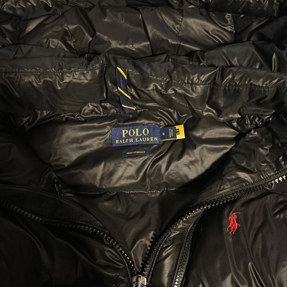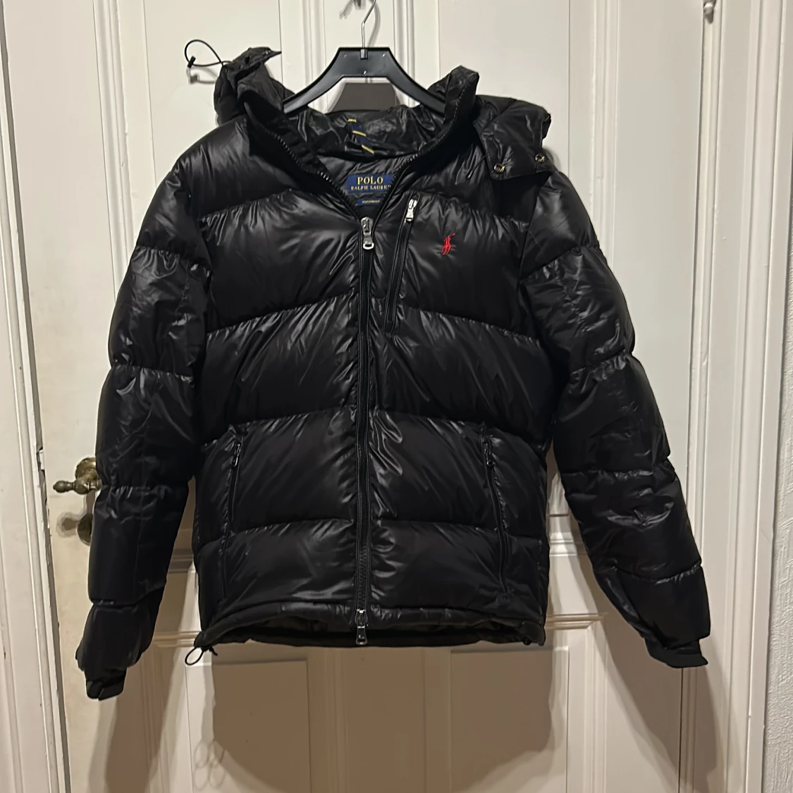 Säljer en svart dunjacka från Polo Ralph Lauren med huva och dragkedja. Jackan har en broderad röd logga på bröstet och är perfekt för kalla dagar. Den är långärmad och har en stilren design. Säljer pga. Förstor, använd fåtal gånger pris är diskuterbart