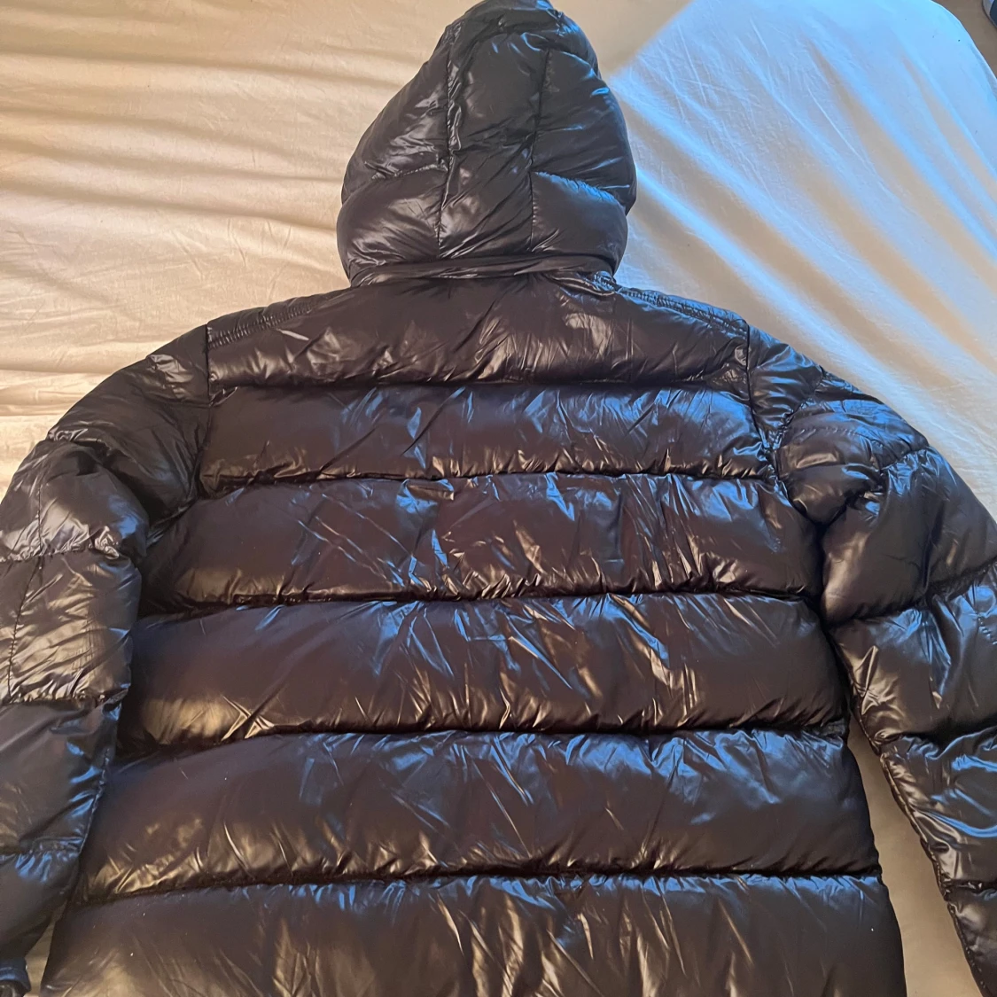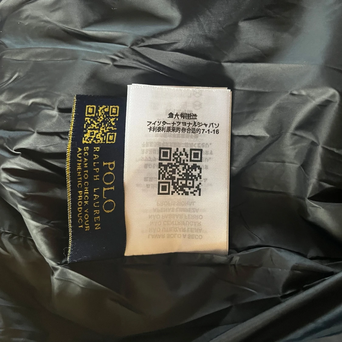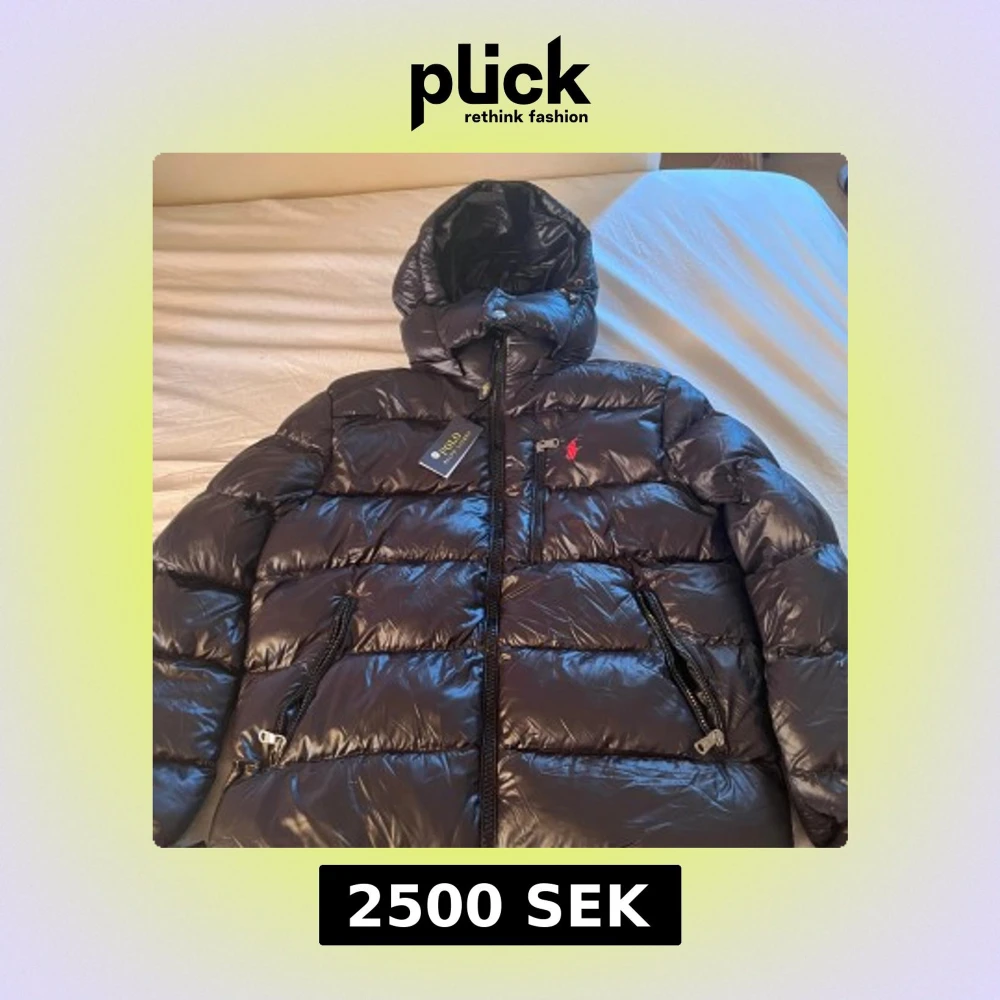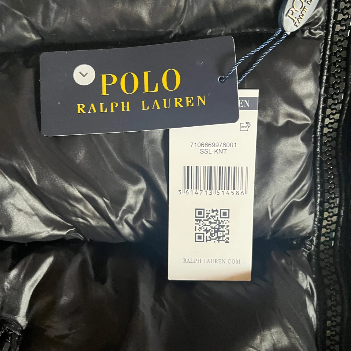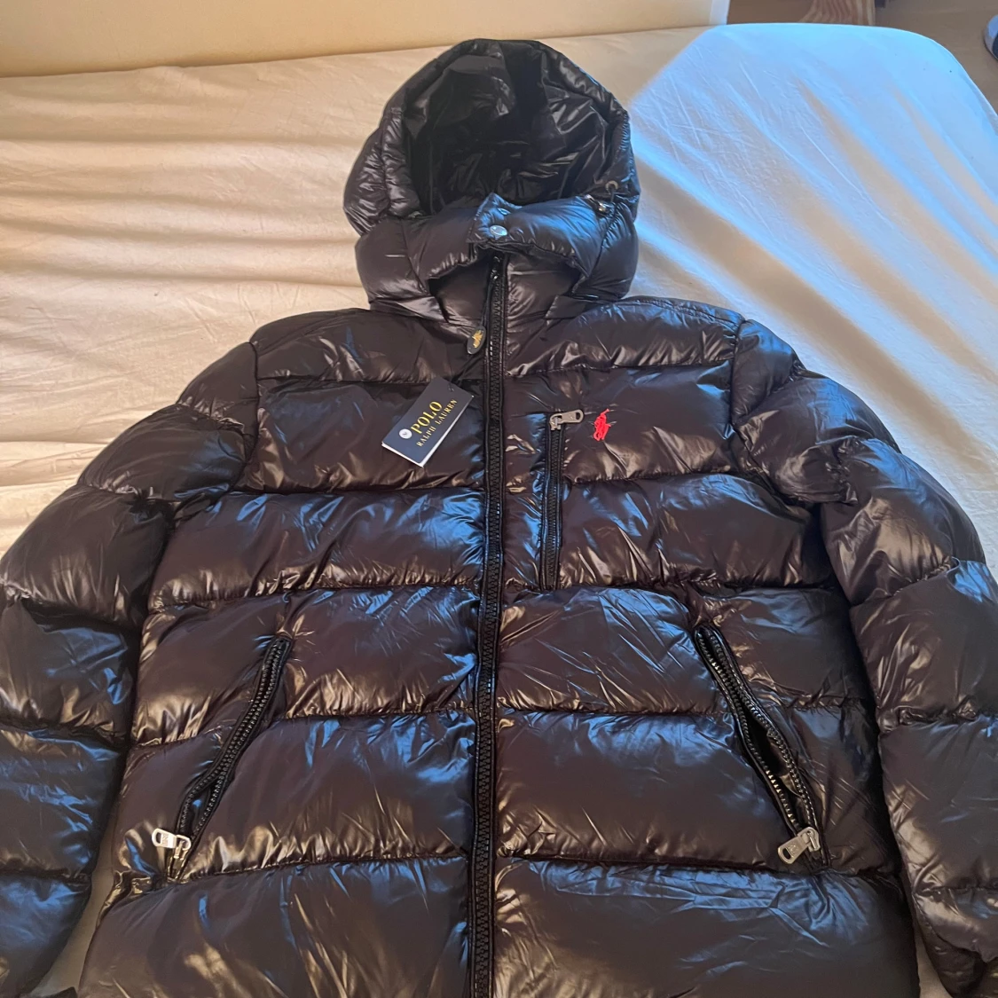 Snygg svart dunjacka från Polo Ralph Lauren med glansig finish, huva och dragkedjor på fickorna. Jackan har klassisk pufferstil och röd broderad logga på bröstet. Perfekt för kalla dagar när du vill hålla stilen och värmen.