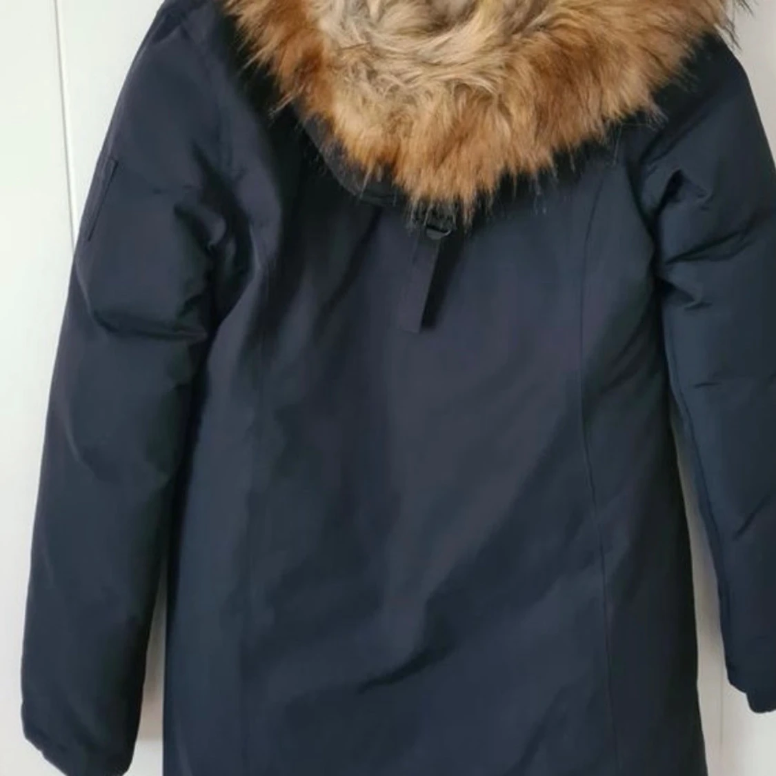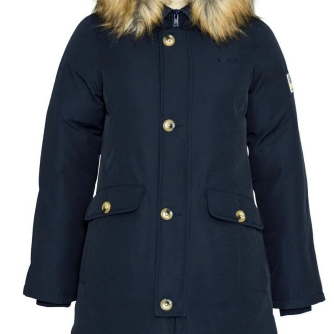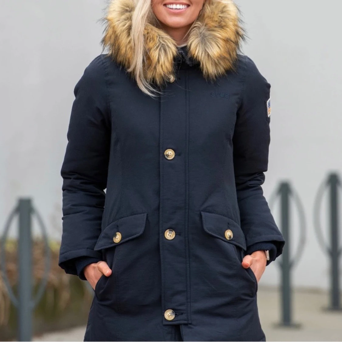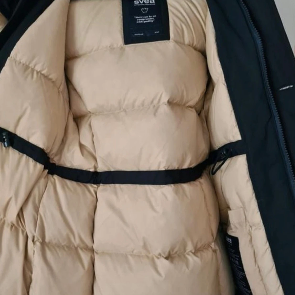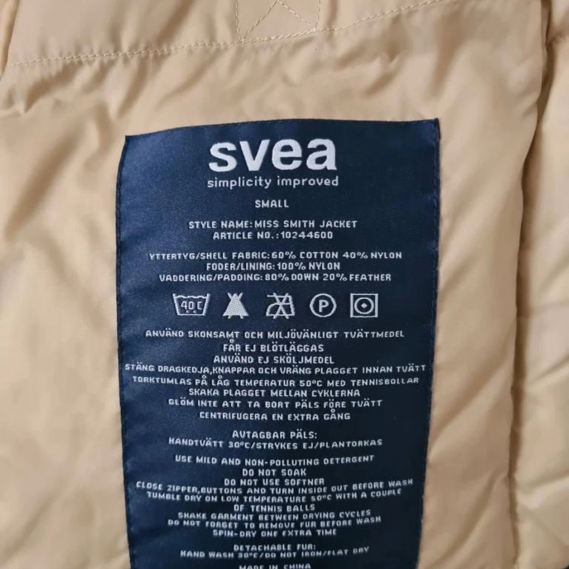 Säljer en snygg svart dunjacka från Svea med pälskantad huva och knappar framtill. Jackan har långa ärmar och praktiska fickor med lock. Perfekt för kalla dagar!