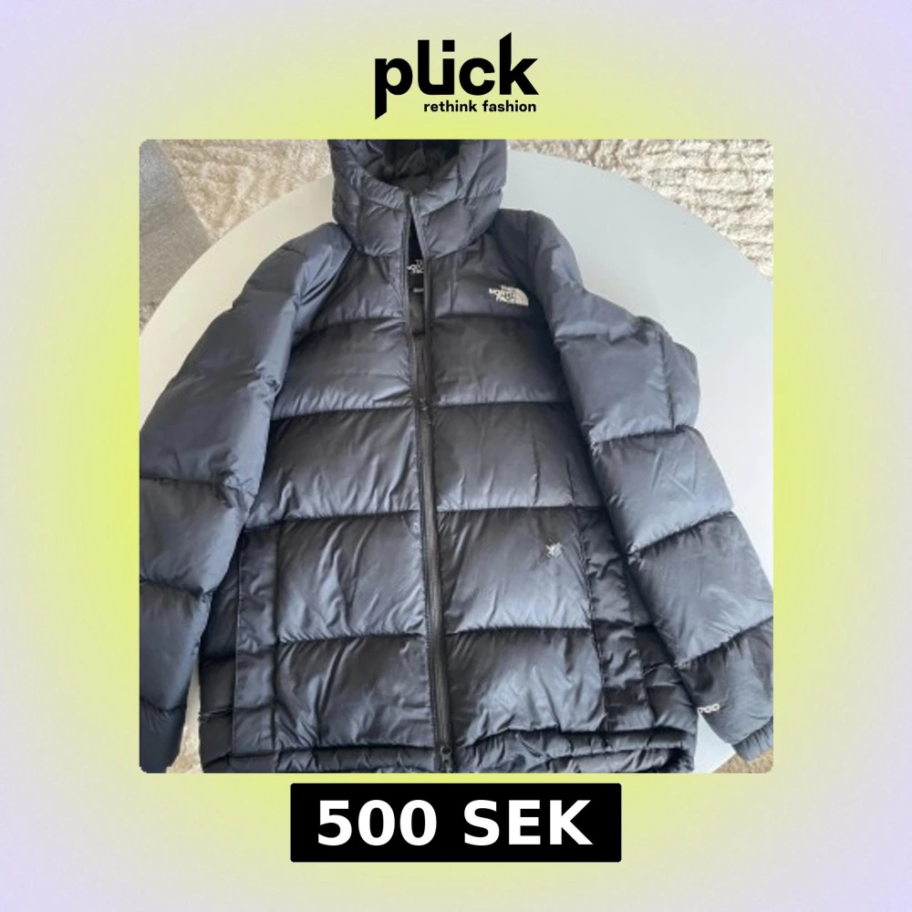 Svart dunjacka från The North Face med klassisk pufferstil och huva. Jackan har dragkedja framtill, två sidofickor och logga på bröstet. finns ett litet hål, se bild (går att laga lätt) Stygn har släppt i nederkant , se bild. Strl S 500:-