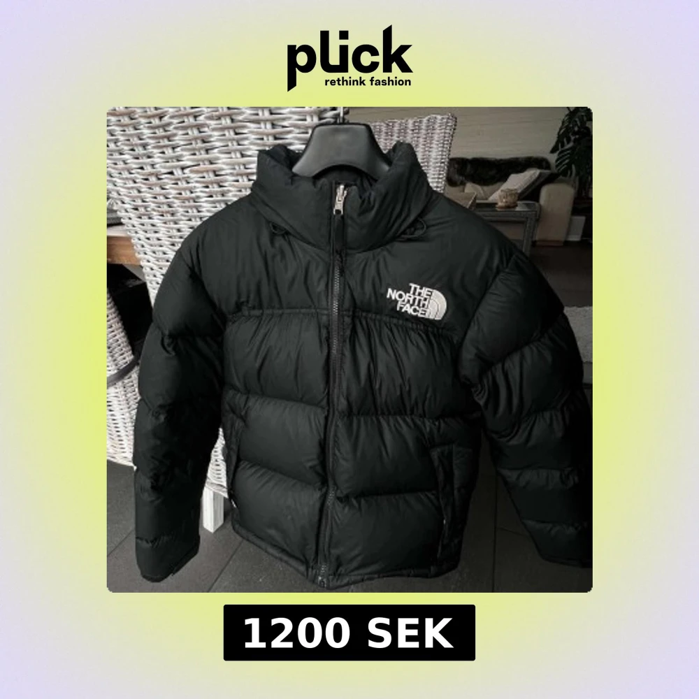 Säljer en svart dunjacka från The North Face med broderad logga på bröstet. Jackan har hög krage, dragkedja framtill och två sidofickor. Perfekt för kyliga dagar och riktigt skön att bära.
