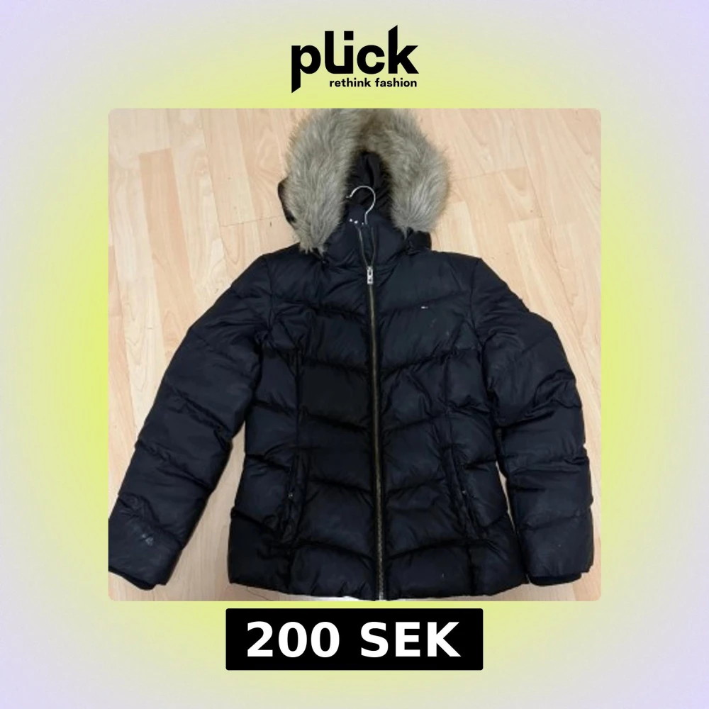 Snygg svart dunjacka från Tommy Hilfiger med huva och fuskpäls. Jackan har dragkedja framtill, två fickor med knappar och klassisk logga på bröstet och ärmen. Perfekt för kalla dagar och riktigt skön att bära. Storlek 164.