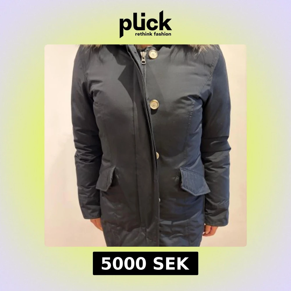 Snygg svart dunjacka från Woolrich med huva och fluffig pälsdetalj. Jackan har långa ärmar, dragkedja och knappar framtill samt två fickor med lock. Perfekt för kalla dagar och har en stilren, lång passform.