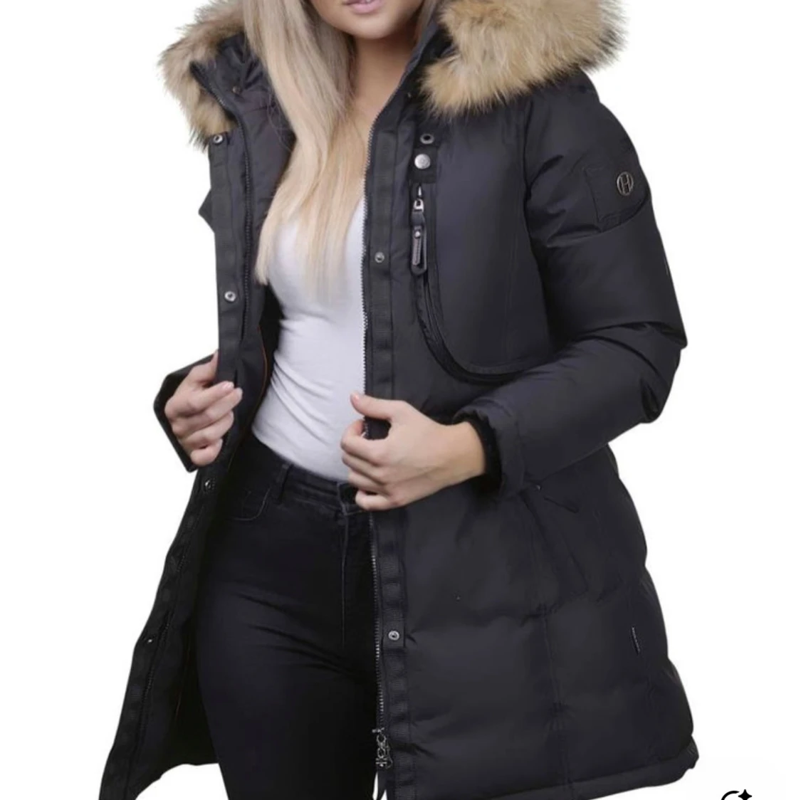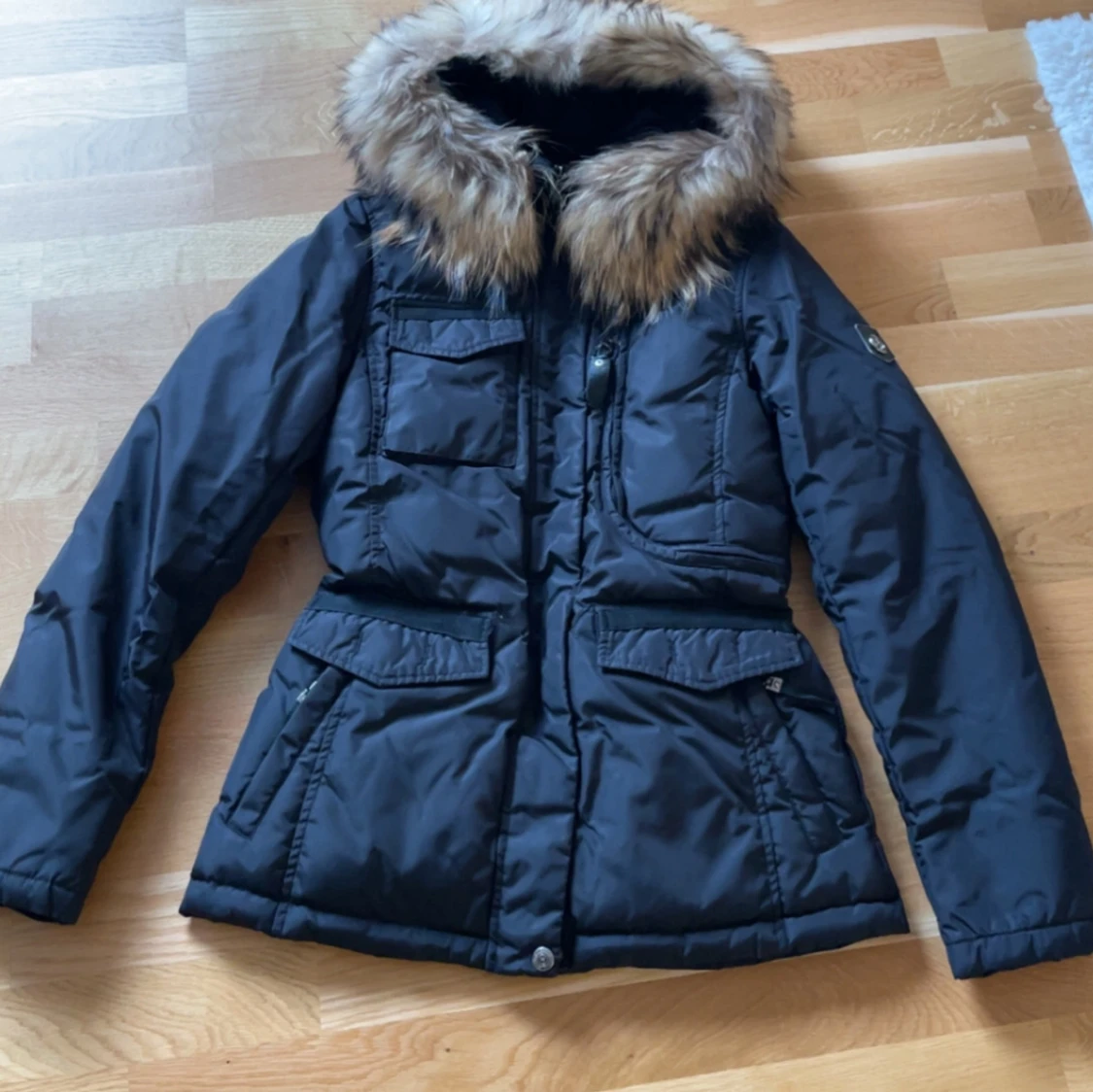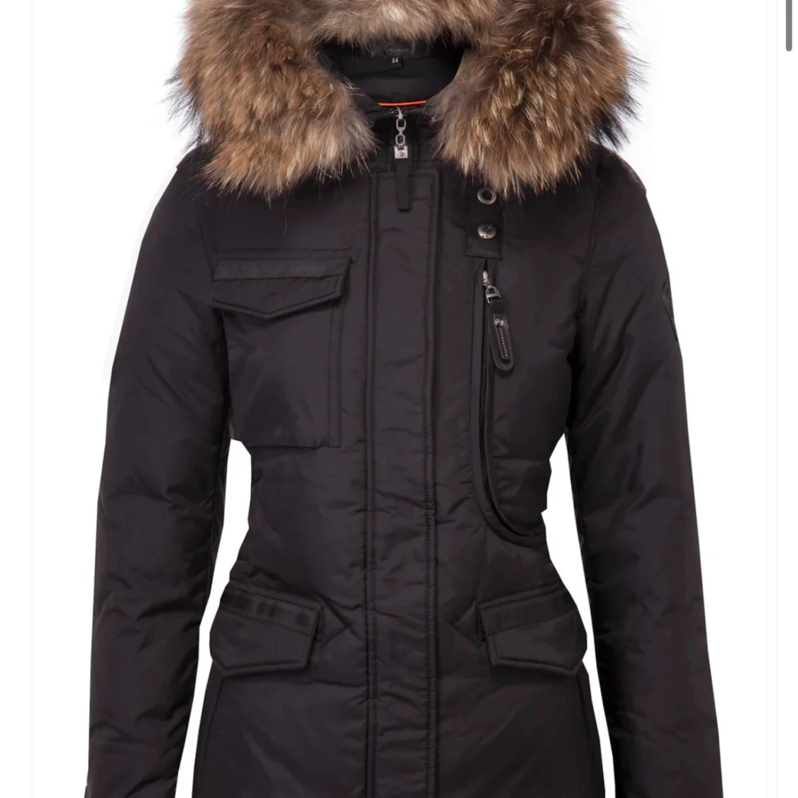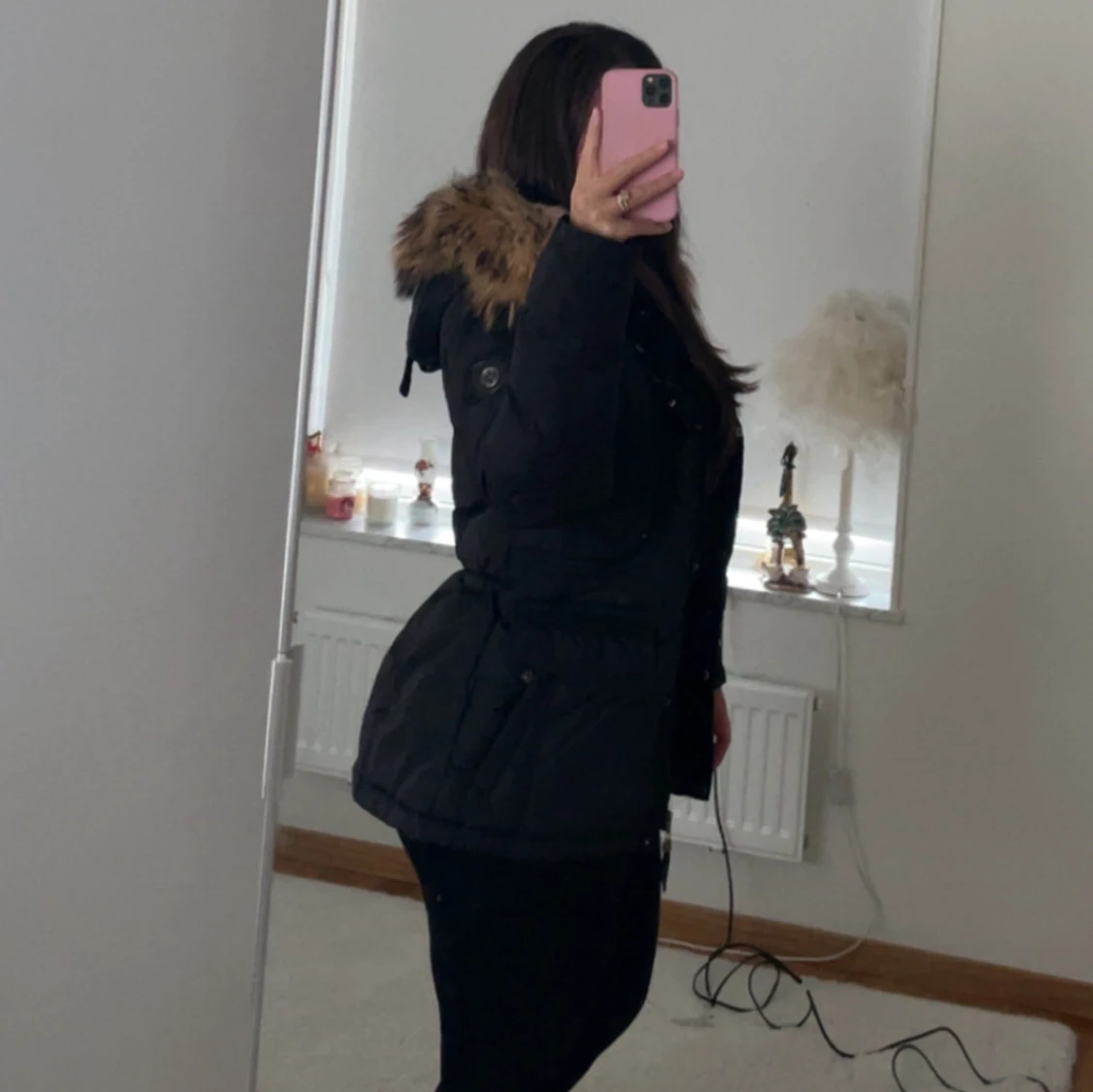 Snygg svart dunjacka från Hollies med stor huva kantad av brun päls. Jackan har flera fickor med lock och dragkedja, markerad justerbar midja och långa ärmar. Perfekt för kalla dagar med sin varma och fluffiga känsla. Klassisk och stilren design som funkar till allt. Jackan har legat i sin plastpåse därav mer ”platt päls”, går att skaka av till normal päls