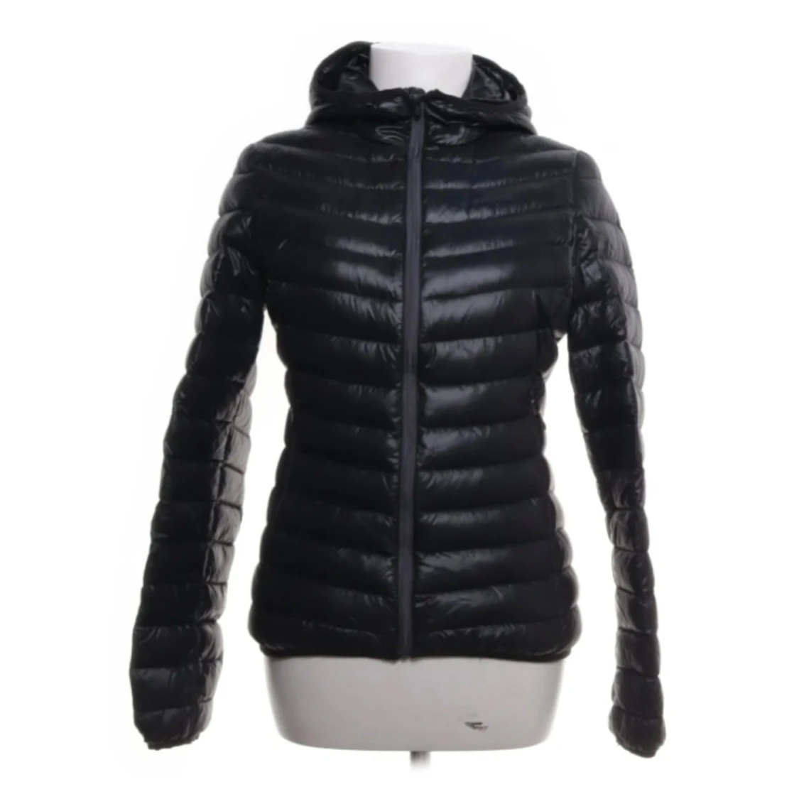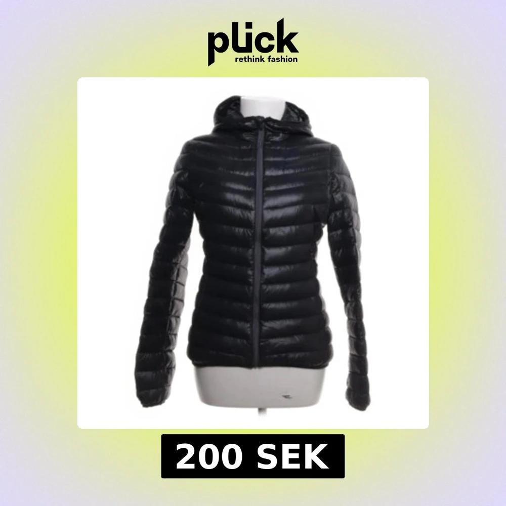 svart dunjacka med huva och dragkedja framtill från everest.Jackan har en quiltad design och långa ärmar, perfekt för kyligare dagar. Storlek 34