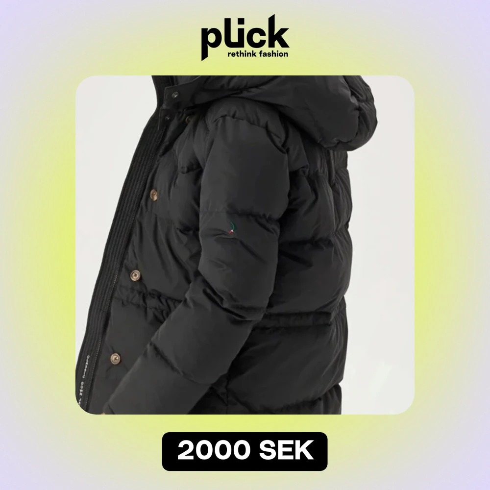 Säljer en snygg svart dunjacka med huva, perfekt för kalla vinterdagar. Jackan har långa ärmar och knappar framtill. Den är både varm och stilren. Köptes flera år sedan men användes enbart i några månader sen dess har den bara legat i garderoben