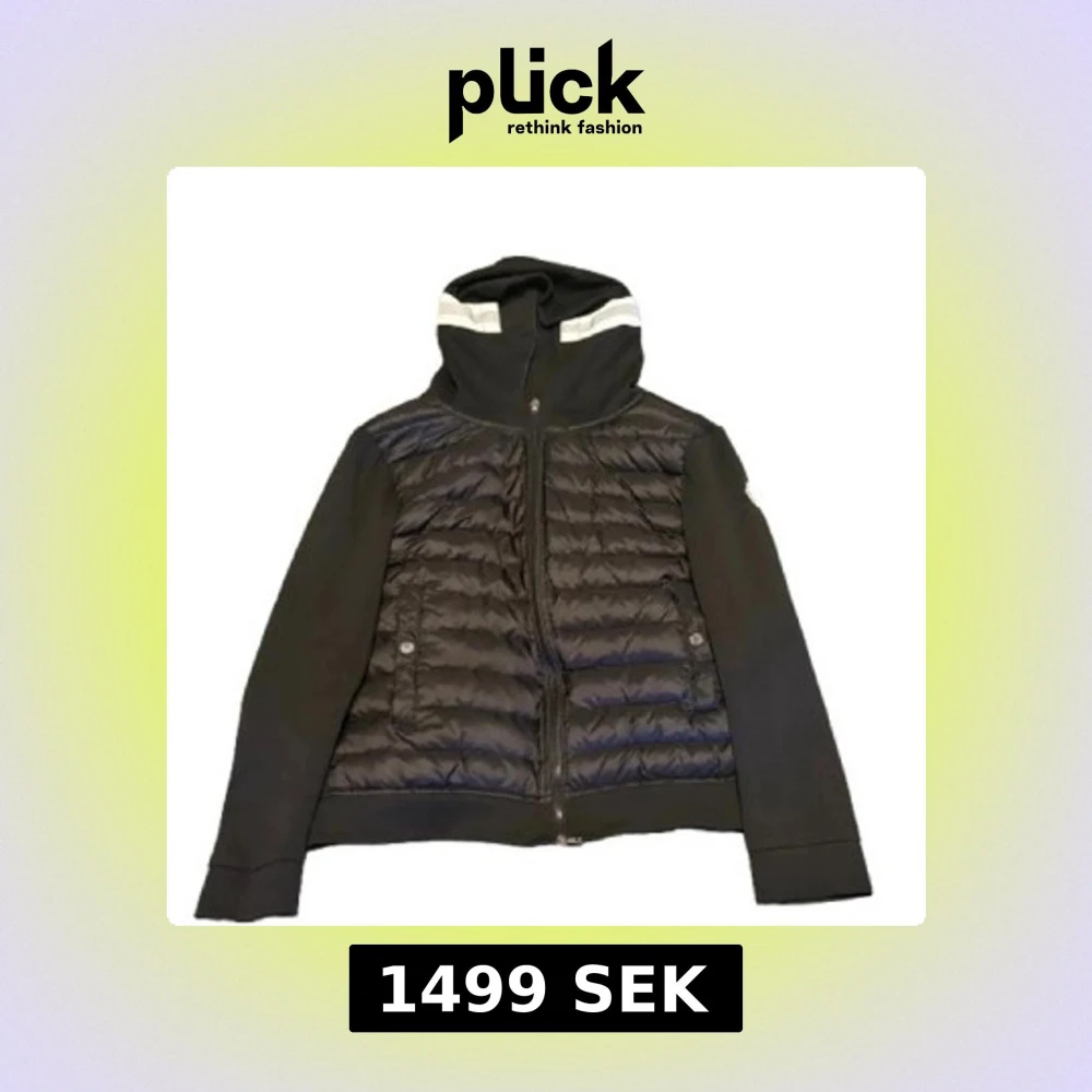 Svart dunjacka från Moncler med quiltad front och släta ärmar. Jackan har huva med vit randdetalj, dragkedja framtill och två fickor med tryckknapp. Perfekt för kyliga dagar och snygg till streetwear.
