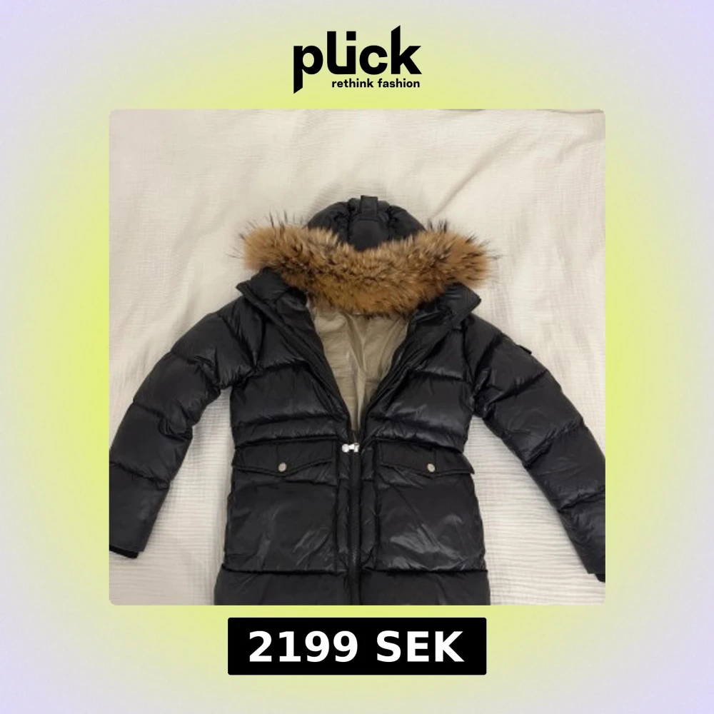 Snygg svart dunjacka från Pyrenex med fluffig brun päls på huvan. Jackan har långa ärmar, två stora fickor med knappar och dragkedja framtill. Perfekt för kalla dagar och har en cool, puffad look som är riktigt trendig. Ena fickan har defekt som visas på sista bilden.