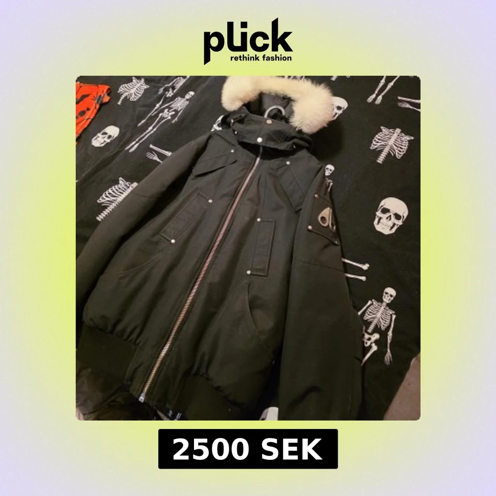 Säljer en svart dunjacka från Moose Knuckles med fluffig vit päls på huvan. Jackan har flera fickor med knappar, grov dragkedja och coolt logomärke på ärmen. Storlek M. Dragkedjan på innerfickan är trasig, har inte försökt att laga.