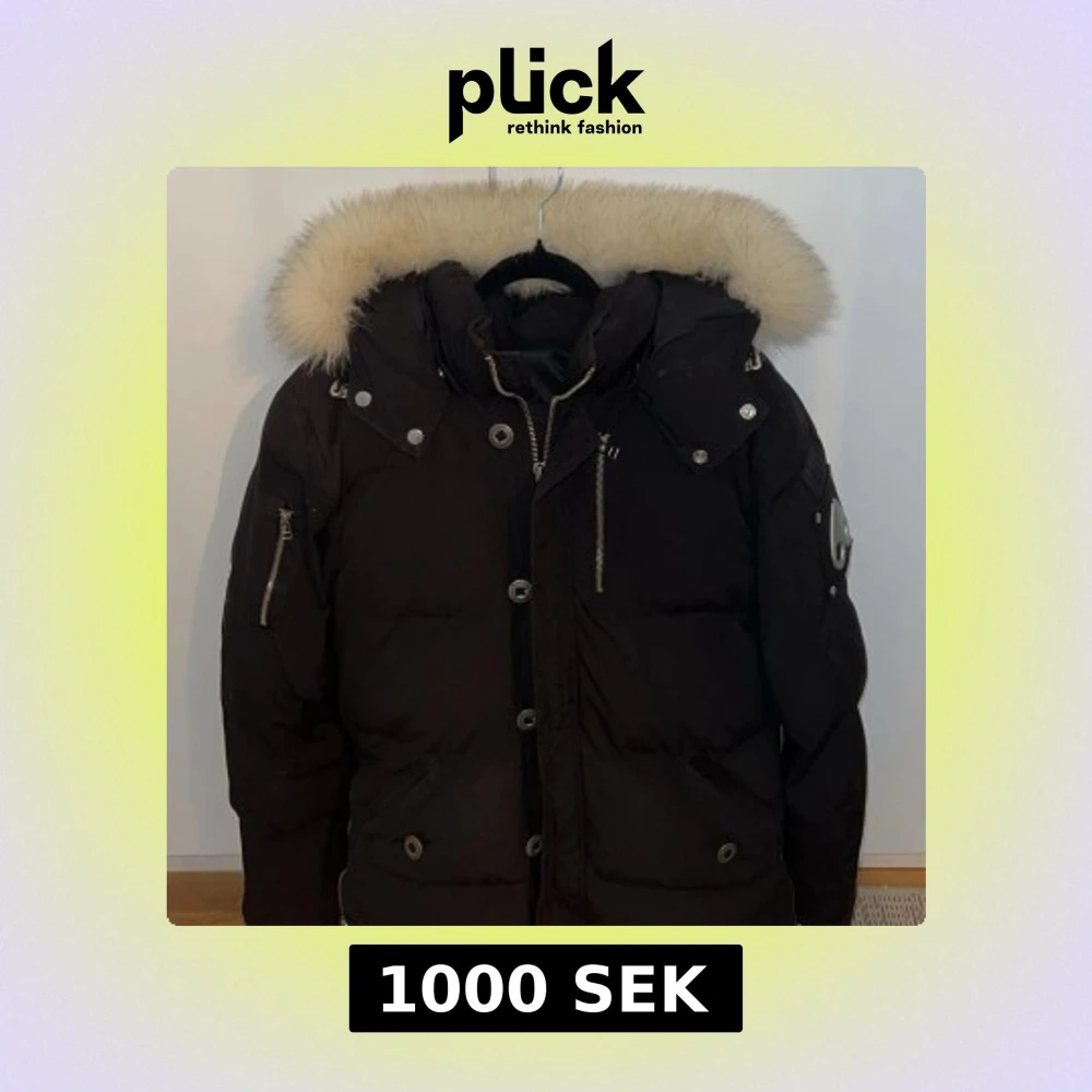 Säljer en svart dunjacka från Moose Knuckles med fluffig vit päls runt huvan. Jackan har flera dragkedjor, knappar och en ikonisk logga på ärmen. Perfekt för kalla vinterdagar och riktigt snygg streetstil.