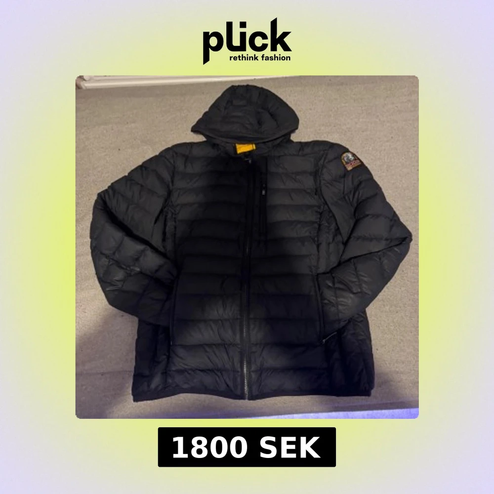 Säljer en svart dunjacka från Parajumpers med huva och dragkedja framtill. Jackan har ett broderat märke på ena ärmen och quiltad design. Perfekt för kalla dagar och har en snygg, sportig look.